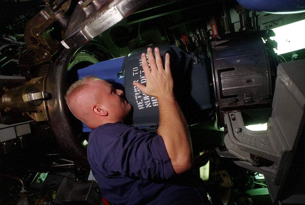 ![]() | 81k | MM2 (SS) Joe Hackett inspects the MK 48 ADCAP torpedo for proper alignment as it enters the torpedo tube during RIMPAC '98 on 19 July 1998. | Official USN photo # DN-SD-00-01125, by PH2 August Sigur, from the Department of Defense Still Media Collection, courtesy of dodmedia.osd.mil. and submitted by Bill Gonyo. | |