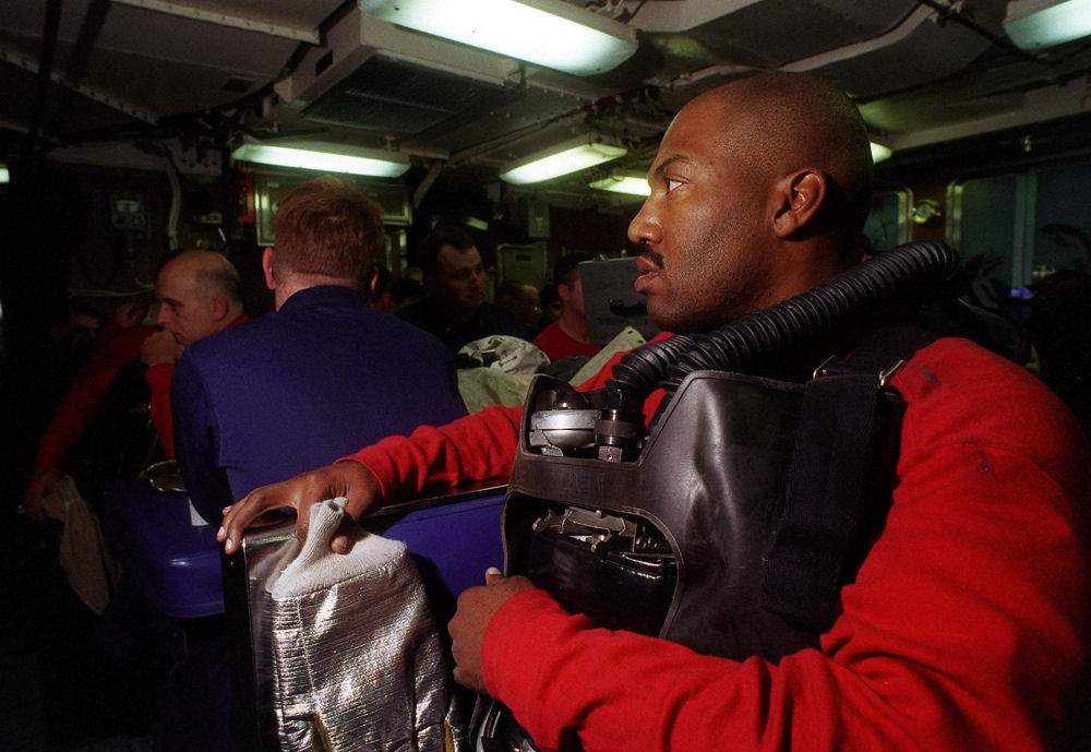 ![]() | 84k | Aboard the attack submarine Pasadena (SSN-752), MM1 (SS) Gary Burkett dons firefighting equipment as he and his damage control team respond to a drill during RIMPAC '98. | USN photo # DN-ST-95-01131 by PH2 August Sigur, from the Department of Defense Still Media Collection, courtesy of dodmedia.osd.mil. and submitted by Bill Gonyo. | |