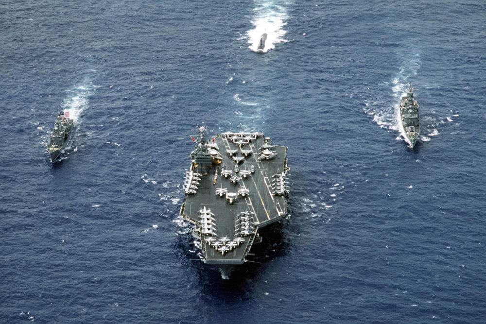 ![]() | 123k | A high oblique bow-on view of WestPac '93 Battle Group Foxtrot underway. (Left to right). The guided missile frigate Ingraham (FFG-61), the nuclear-powered attack submarine Pasadena (SSN-752), the nuclear-powered aircraft Abraham Lincoln (CVN-72), and the guided missile cruiser Fox (CG-33), on 1 June 1993. | USN photo # DN-ST-95-011789 by PH2 Dale W. Novotasky, from the Department of Defense Still Media Collection, courtesy of dodmedia.osd.mil. | |