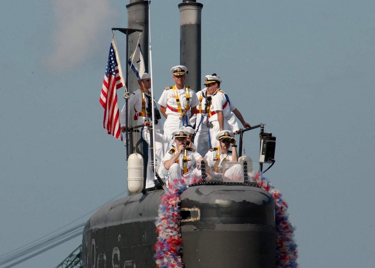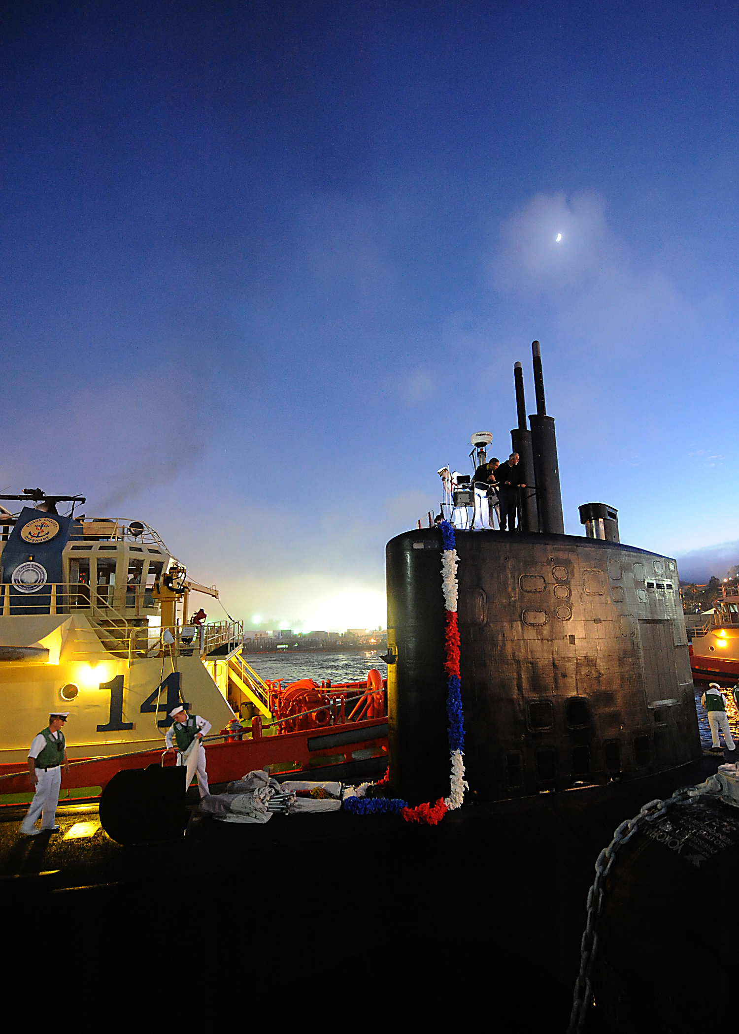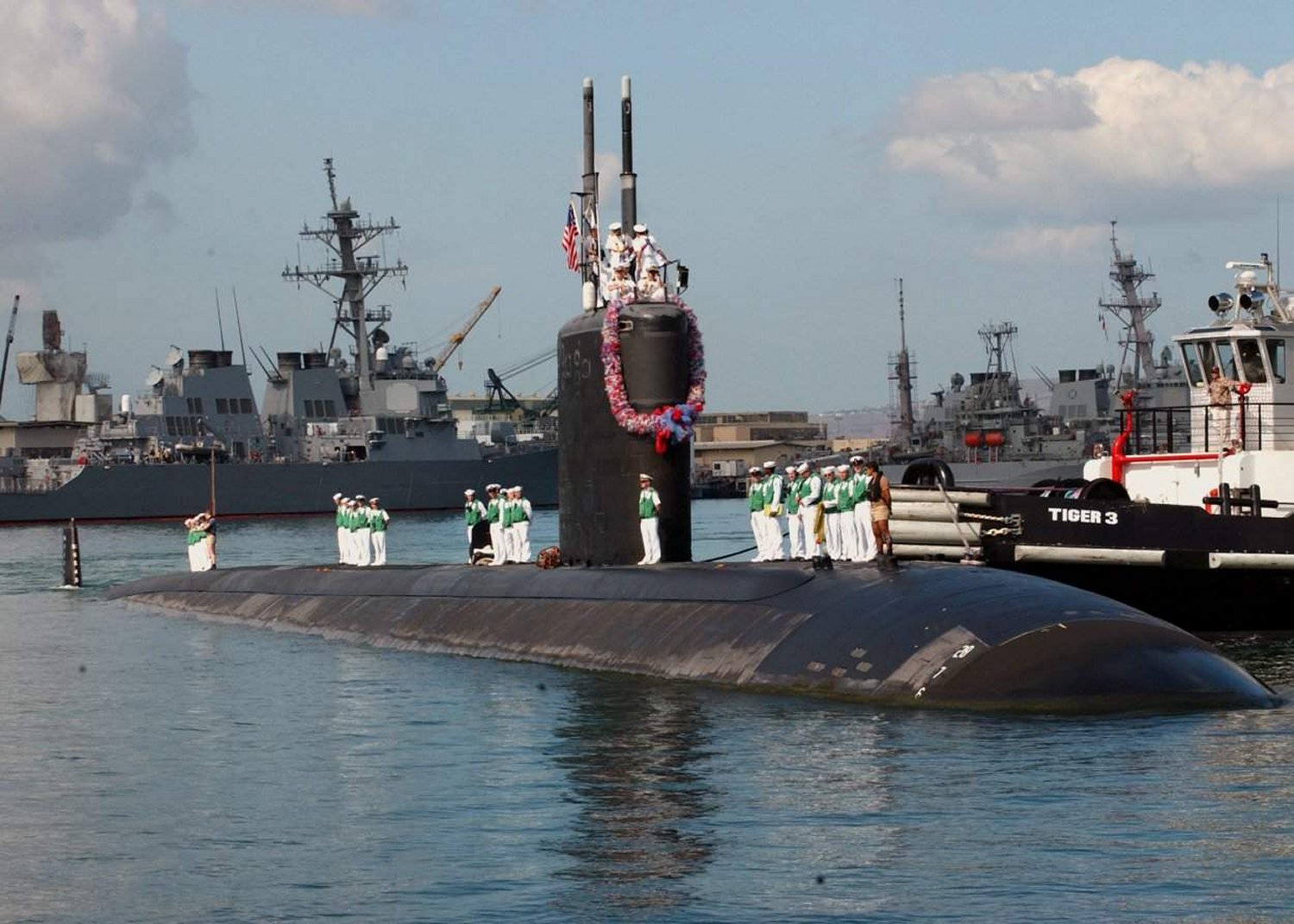 ![]() | 70k | Crewmembers aboard Pasadena (SSN-752) scan the pier for family and friends as the fast attack submarine returns to its homeport of Pearl Harbor, Hawaii, 31 October 2003, following an eight-month deployment to the Western Pacific. | USN photo # N-5376G-007 by Photographer's Mate Airman Benjamin D. Glass. | |