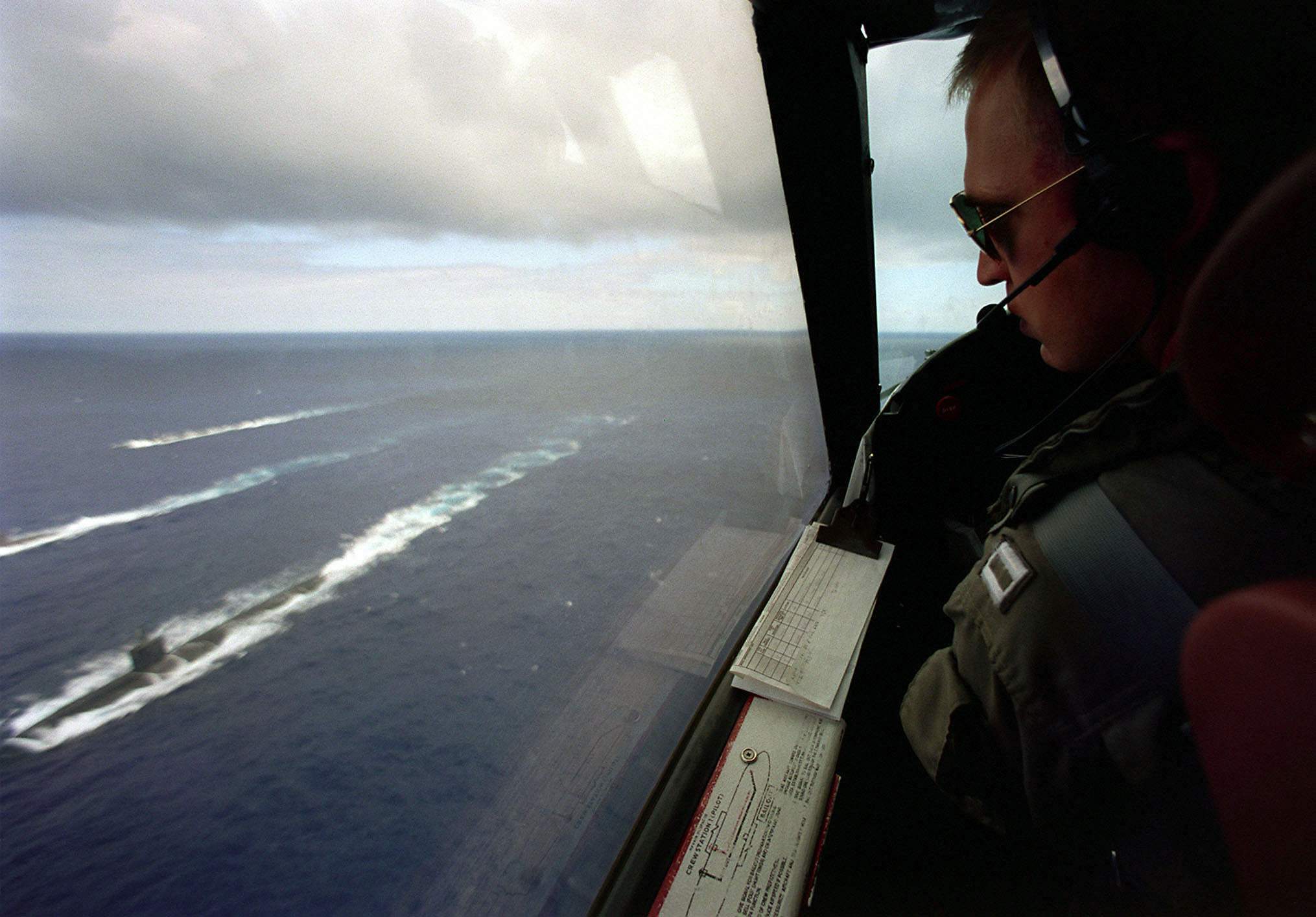 ![]() | 233k | Flying 200 feet over the ocean during exercise RIMPAC '98, LT Daryl Lierman looks at a trio of submarines: the Pasadena (SSN-752) (top), Republic of Korea Ship Lee Jong Moo (SS-66) (center) and Columbus (SSN-762), (bottom) patrol the Pacific Ocean during Exercise RIMPAC '98, 19 July 1998 near Hawaii. | USN photo # N-5961C=002 by Photographer's Mate JO1 Spike Call, from the Department of Defense Still Media Collection, courtesy of dodmedia.osd.mil. | |