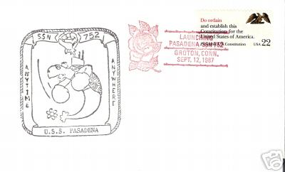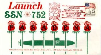 ![]() | 14k | Commemorative postal cover issued on the occasion of the Pasadena's (SSN-752) launching at the Electric Boat Division, General Dynamics Corp., Groton, CT., 12 September 1987. | Courtesy of Jack Treutle (of blessed memory). | |
