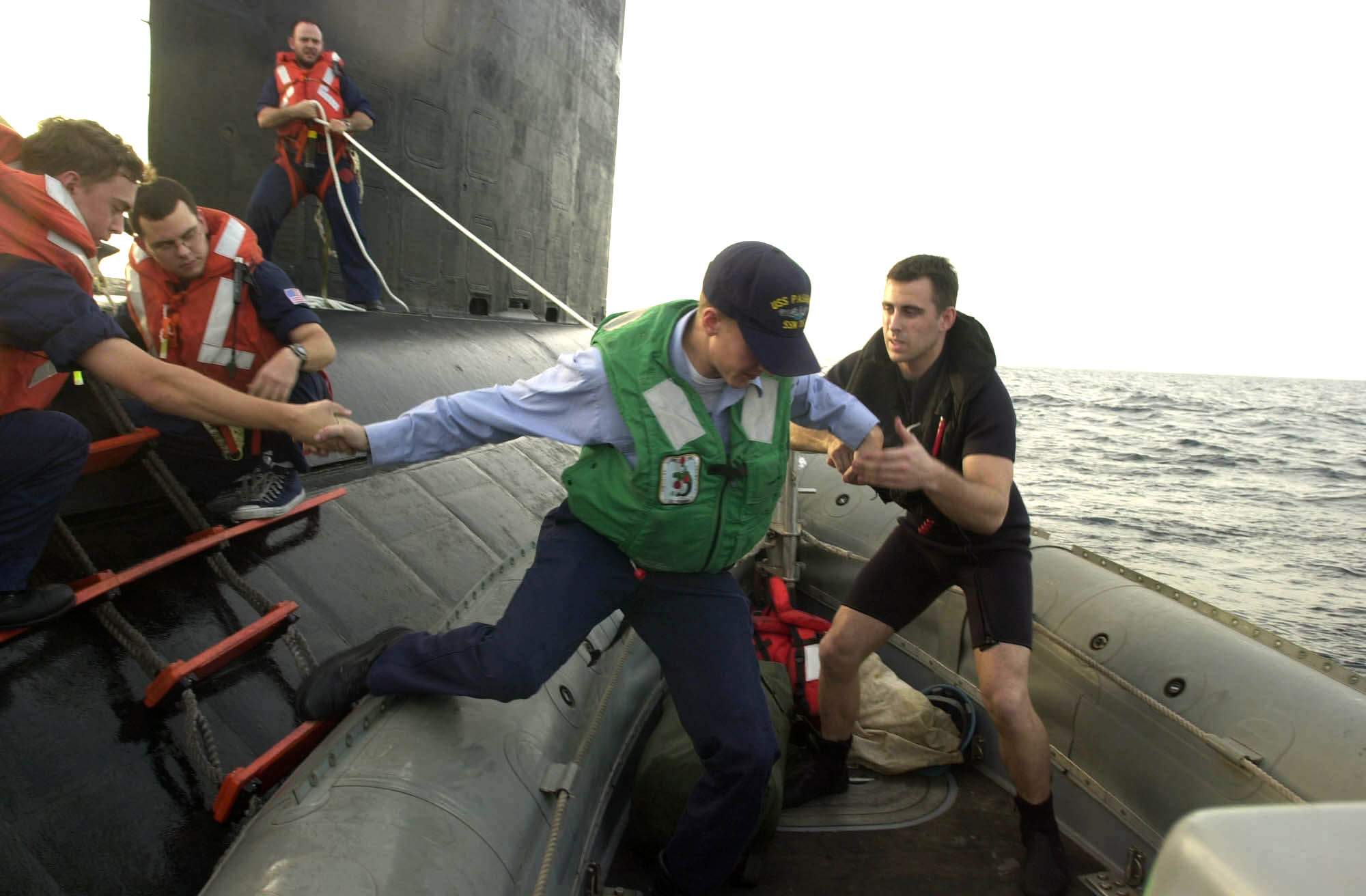 ![]() | 154k | Boatswain's Mate 2nd Class Casey Opdahl from Bismarck, N.D. helps an emergency medical patient onto the rigid hull inflatable boat (RHIB) from the attack submarine Pasadena (SSN-752). | USN photo # N-2385R-008 by Photographer's Mate 3rd Class Yesenia Rosas, courtesy of news.navy.mil. | |
