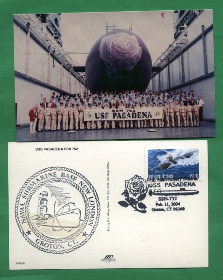 ![]() | 23k | Commemorative postal cover issued on the occasion of the Pasadena's (SSN-752) 15th year as a commissioned ship, 11 February 2004. | Courtesy of Jack Treutle (of blessed memory). | |