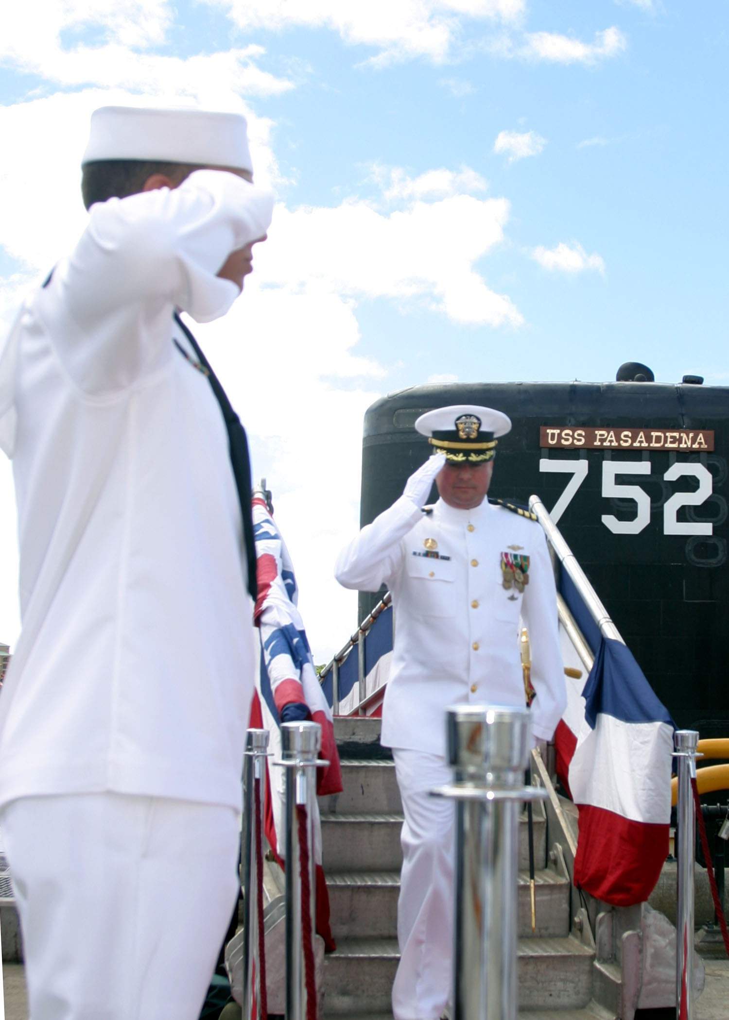 ![]() | 169k | Cmdr. John Heatherington is piped ashore after assuming command of Pasadena (SSN-752). Heatherington relieved Cmdr. Donald Fritts, Jr. during a change of command ceremony on 18 June 2004 at Pearl Harbor Naval Station's submarine piers. | USN photo by JO3 Corwin Colbert, courtesy of news.navy.mil. | |