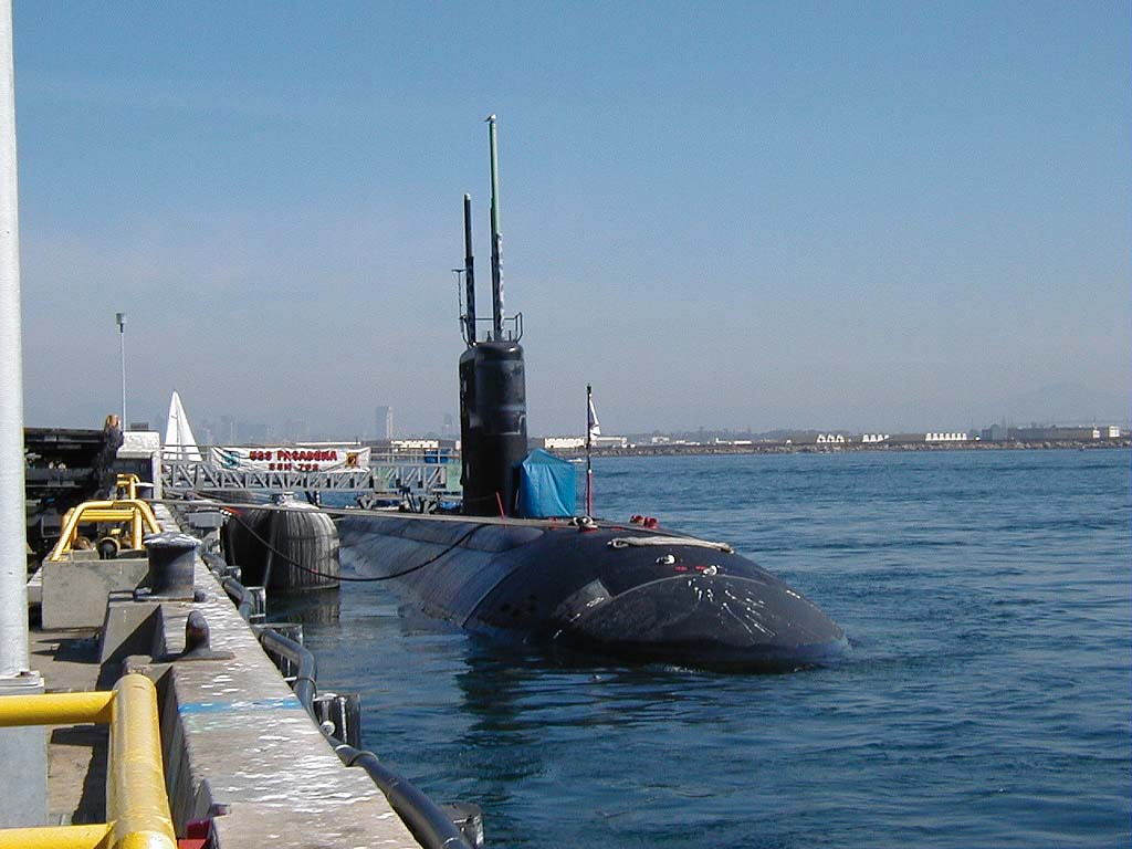 ![]() | 92k | Pasadena (SSN-752) at dock. The hump on the left of the hull is where they stow the towed array sonar cable. The red mooring cleats are stowed when under way. | USN photo & text courtesy of usspasadena.org. & submitted by Bill Gonyo. | |