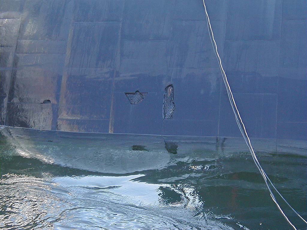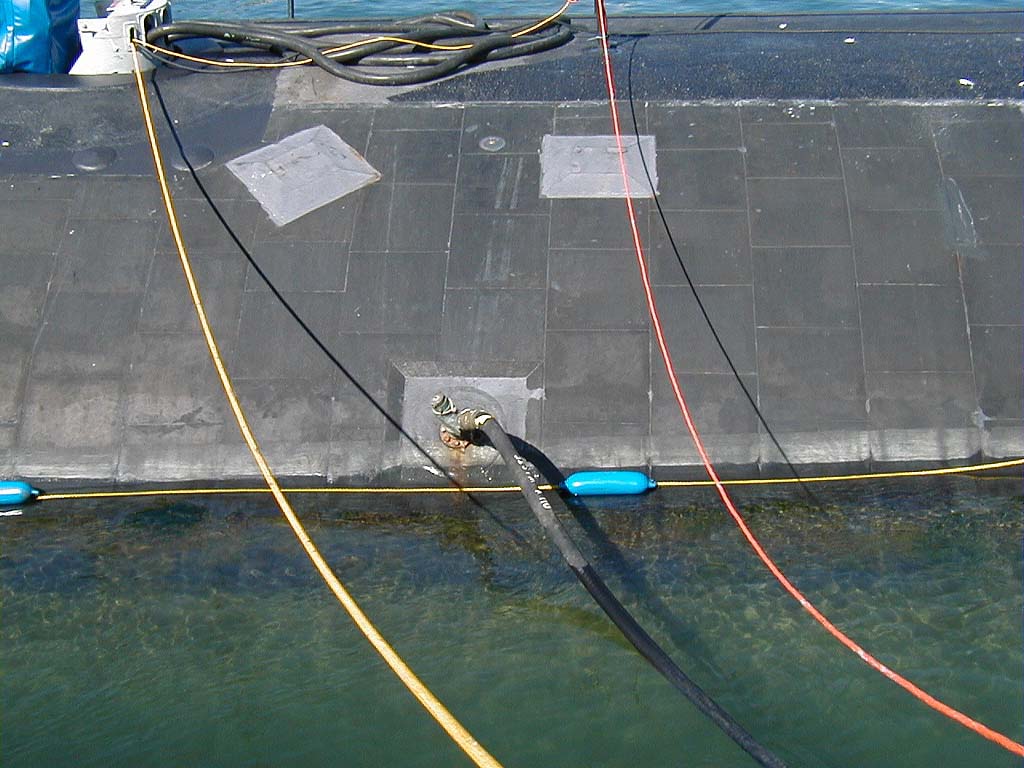 ![]() | 122k | Here you can see some gouges in the anechoic rubber coating the hull of the Pasadena (SSN-752) is layered with. For scale, the tall gouge is about 18" long. | USN photo & text courtesy of usspasadena.org. & submitted by Bill Gonyo. | |
