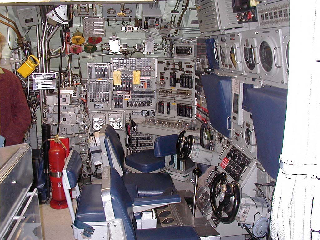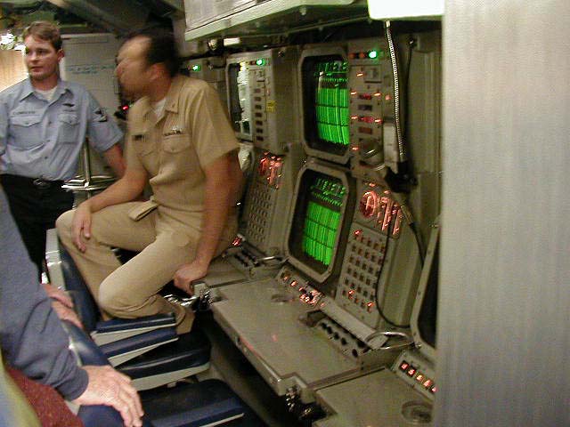 ![]() | 167k | The entire weaps console system on the Pasadena's (SSN-752) bridge. The periscopes and helm are immediately behind the chairs here. | USN photo & text courtesy of usspasadena.org. & submitted by Bill Gonyo. | |