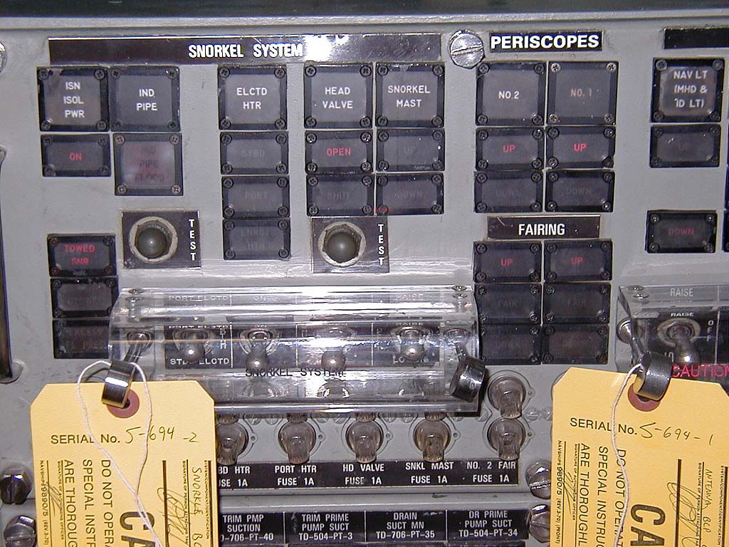 ![]() | 171k | The green fitting is on the starboard side of the hull. Under it is the motor that deploys the bow planes, which are kept retracted when docked. There is a red one behind the camera. | USN photo & text courtesy of usspasadena.org. & submitted by Bill Gonyo. | |