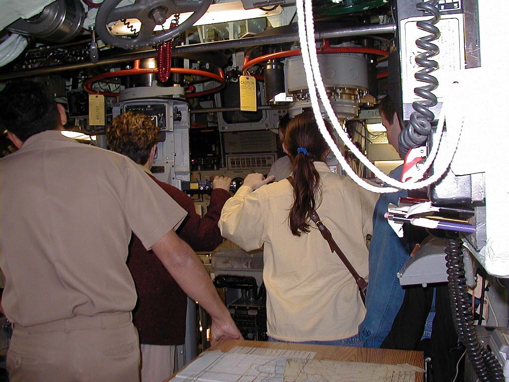 ![]() | 52k | Chief Evans, with a blurry head, explains the sonar. No flash used here which explains the blur as well as the fact that you can see the displays. | USN photo & text courtesy of usspasadena.org. & submitted by Bill Gonyo. | |