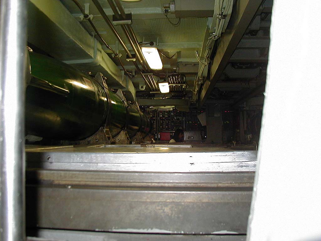 ![]() | 112k | Looking aft. The apparatus in the floor and ceiling is part of a cradle system they use to load torpedoes on board. | USN photo & text courtesy of usspasadena.org. & submitted by Bill Gonyo. | |