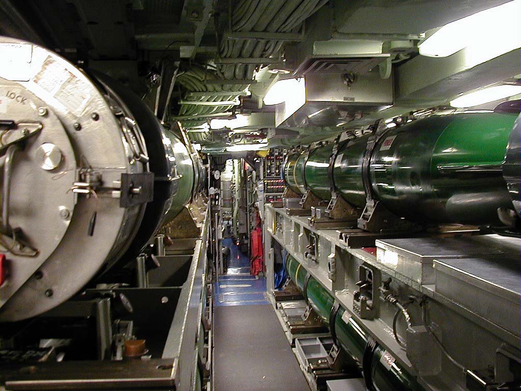 ![]() | 134k | You can see part of the weaps control panel to the right. Note the yellow stripe on the fish -- these are war shots, not practice shots. This room is packed with high explosive and self-oxidizing fuel. | USN photo & text courtesy of usspasadena.org. & submitted by Bill Gonyo. | |