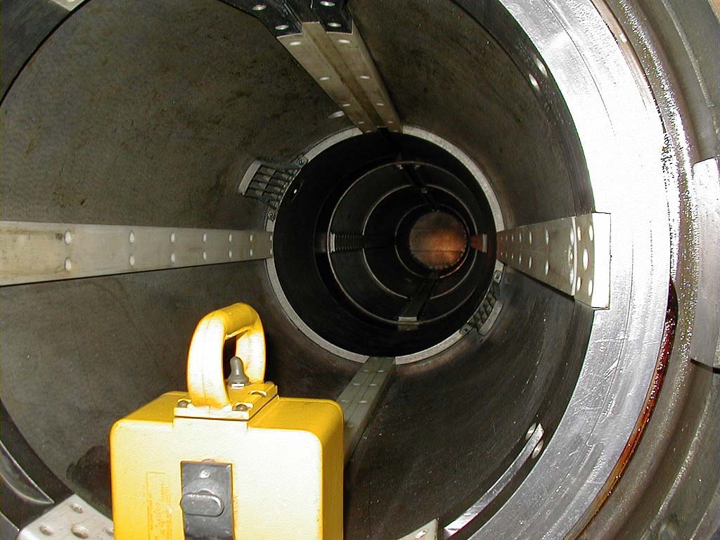 ![]() | 116k | This is the interior of a torpedo tube. The yellow box is a flashlight, which they have mounted all over the Pasadena (SSN-752). The white rails in the tube felt like Teflon. The grilles are where they shoot in pressurized water to fire the torpedo out of the tube. | USN photo & text courtesy of usspasadena.org. & submitted by Bill Gonyo. | |