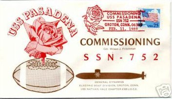 ![]() | 23k | Commemorative postal cover issued on the occasion of the Pasadena's (SSN-752) commissioning at the Electric Boat Division, General Dynamics Corp., Groton, CT., 11 February 1989. | Courtesy of Jack Treutle (of blessed memory). | |