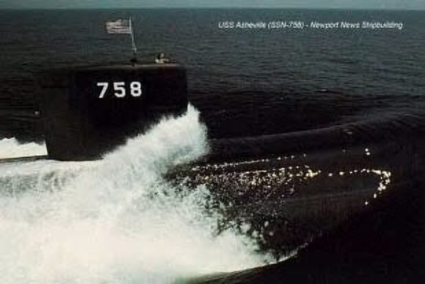 ![]() | 195k | A bow view of the nuclear-powered attack submarine Asheville (SSN-758) underway during pre-commissioning trials off the Virginia Capes on 10 June 1991. | Official USN photo # DN-SN-92-03098 by Mike Dillard, courtesy of Newport News Shipbuilding, from the Department of Defense Still Media Collection, courtesy of dodmedia.osd.mil. | |