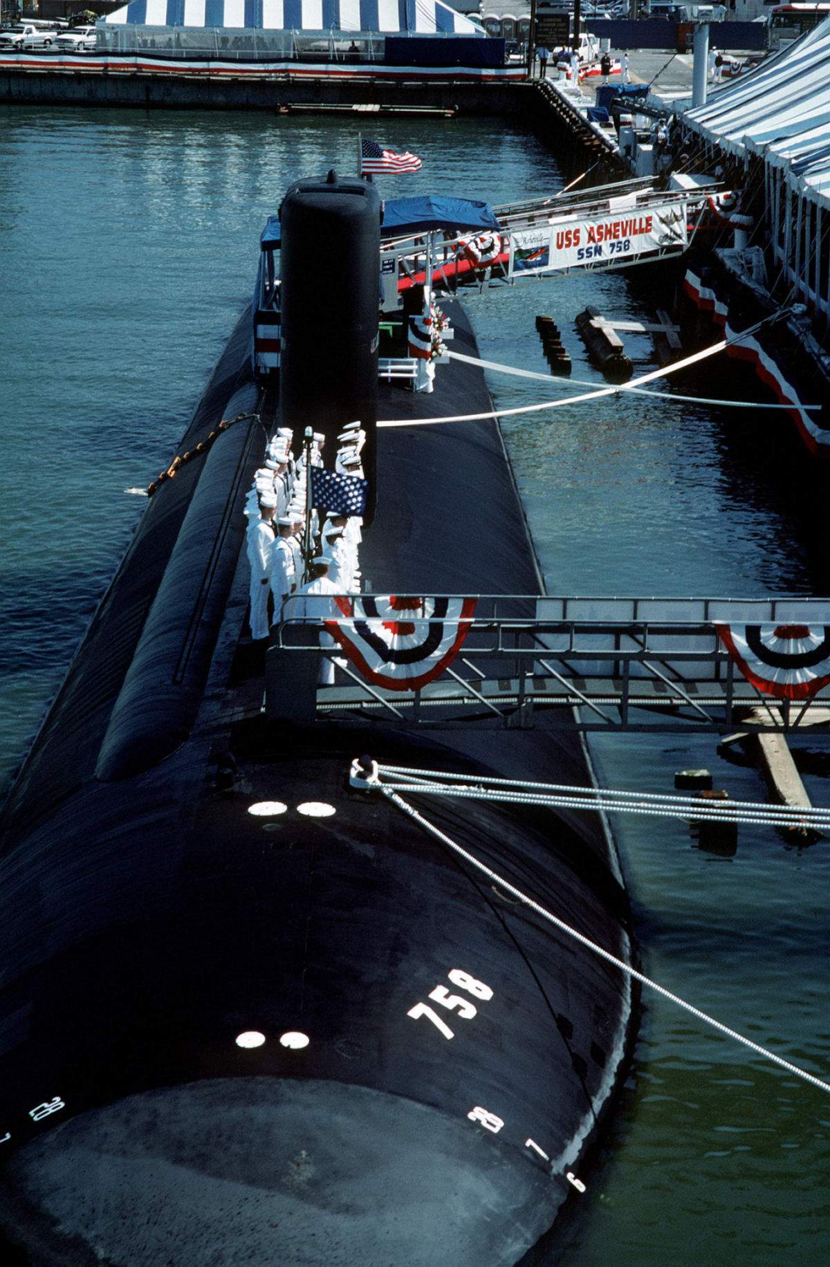 ![]() | 290k | Crew members stand at attention near the bow of the nuclear-powered attack submarine Asheville (SSN-758) during its commissioning ceremony on 28 September 1991. | Official USN photo # DN-ST-92-00941 by JO1 Gregg L. Snaza, from the Department of Defense Still Media Collection, courtesy of dodmedia.osd.mil. | |