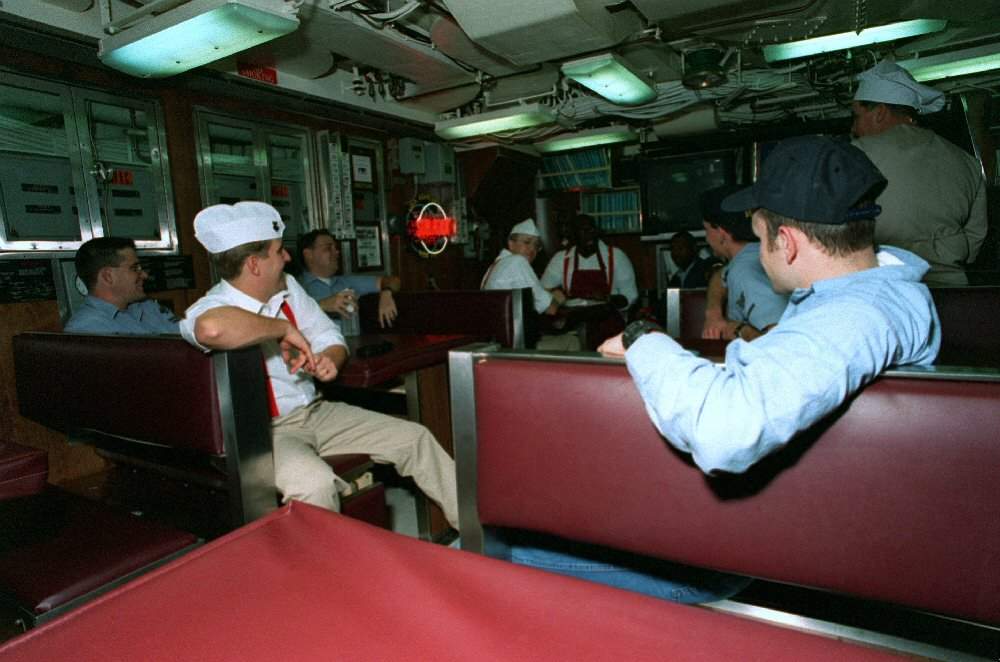 ![]() | 68k | Galley crewmembers and some other sailors take a break in the crews mess on board the nuclear-powered attack submarine Asheville (SSN-758) on 9 January 1995. | USN photo # DN-SC-95-01776, by PH2 Rick Gilmore, from the Department of Defense Still Media Collection, courtesy of dodmedia.osd.mil. & submitted by Bill Gonyo. | |