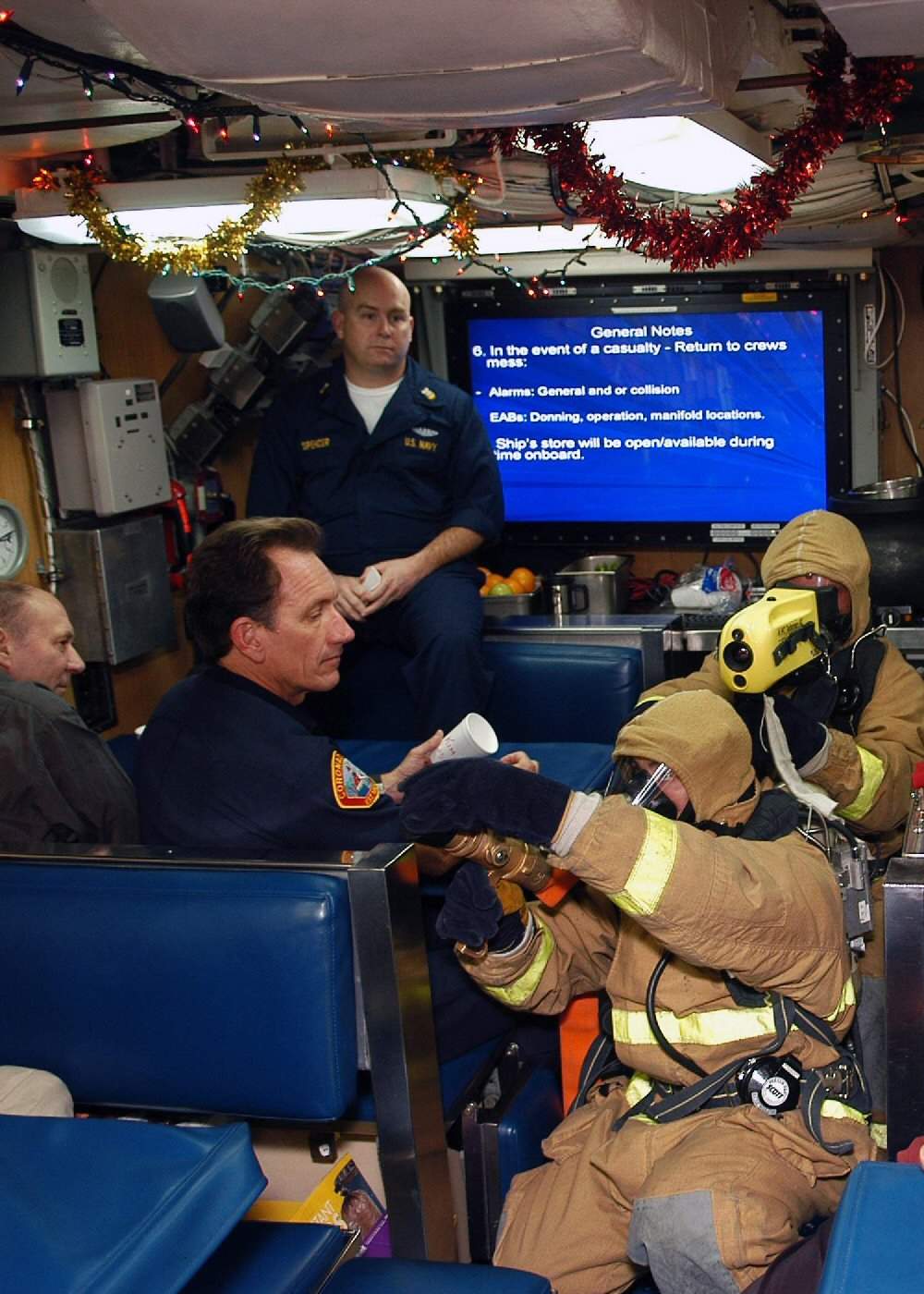 ![]() | 149k | Sailors aboard the nuclear-powered attack submarine Asheville (SSN-758) demonstrate how the fire party carries out fire-fighting procedures during a safety brief on 13 December 2007. Civilians were given the opportunity to get underway with for a daytime ride to observe how the boat functions. | USN photo # N-1226D-196, by Mass Communication Specialist Seaman Omar A. Dominquez, courtesy of news.navy.mil.& submitted by Bill Gonyo. | |