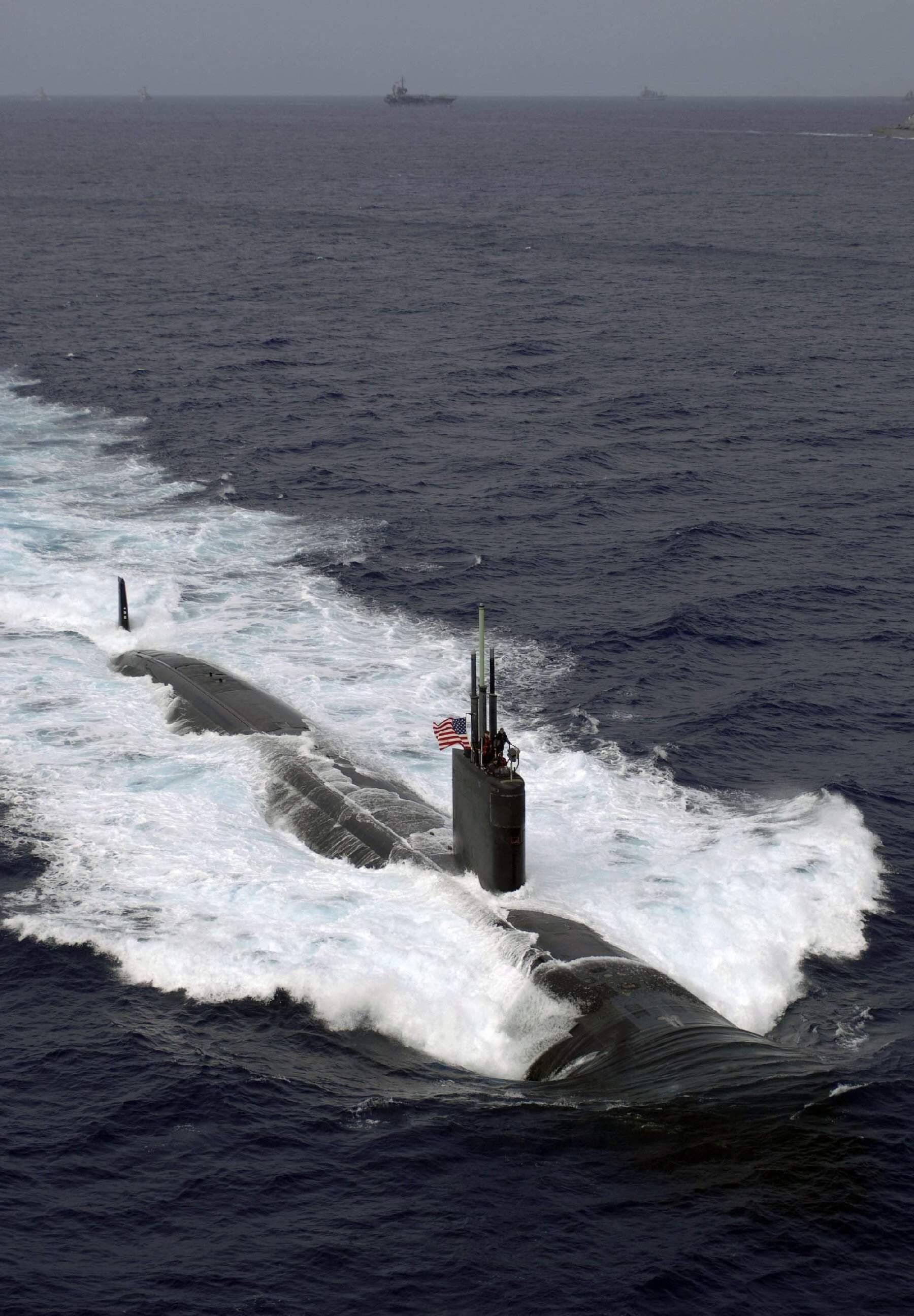 ![]() | 410k | The attack submarine Asheville (SSN-758) steams out in front of the of the Kitty Hawk (CV-63) carrier strike group and ships of the Japanese Maritime Self-Defense Force (JMSDF) during the U.S. and JMSDF exercise ANNUALEX on 14 November 2006. The exercise is designed to improve both forces' capabilities in the defense of Japan. Approximately 8,500 U.S. Sailors are taking part aboard 13 ships, submarines and various shore-based aircraft. About 90 JMSDF ships and 130 aircraft are also participating. The aircraft, which operate from Naval Air Facility Atsugi, Japan, are deployed aboard the Kitty Hawk. Kitty Hawk and most of the U.S.-participating ships operate from Fleet Activity Yokosuka, Japan; the remainders are based in the United States. | USN photo # N-8492C-067, by Chief Mass Communication Specialist Todd P. Cichonowicz, courtesy of news.navy.mil. | |