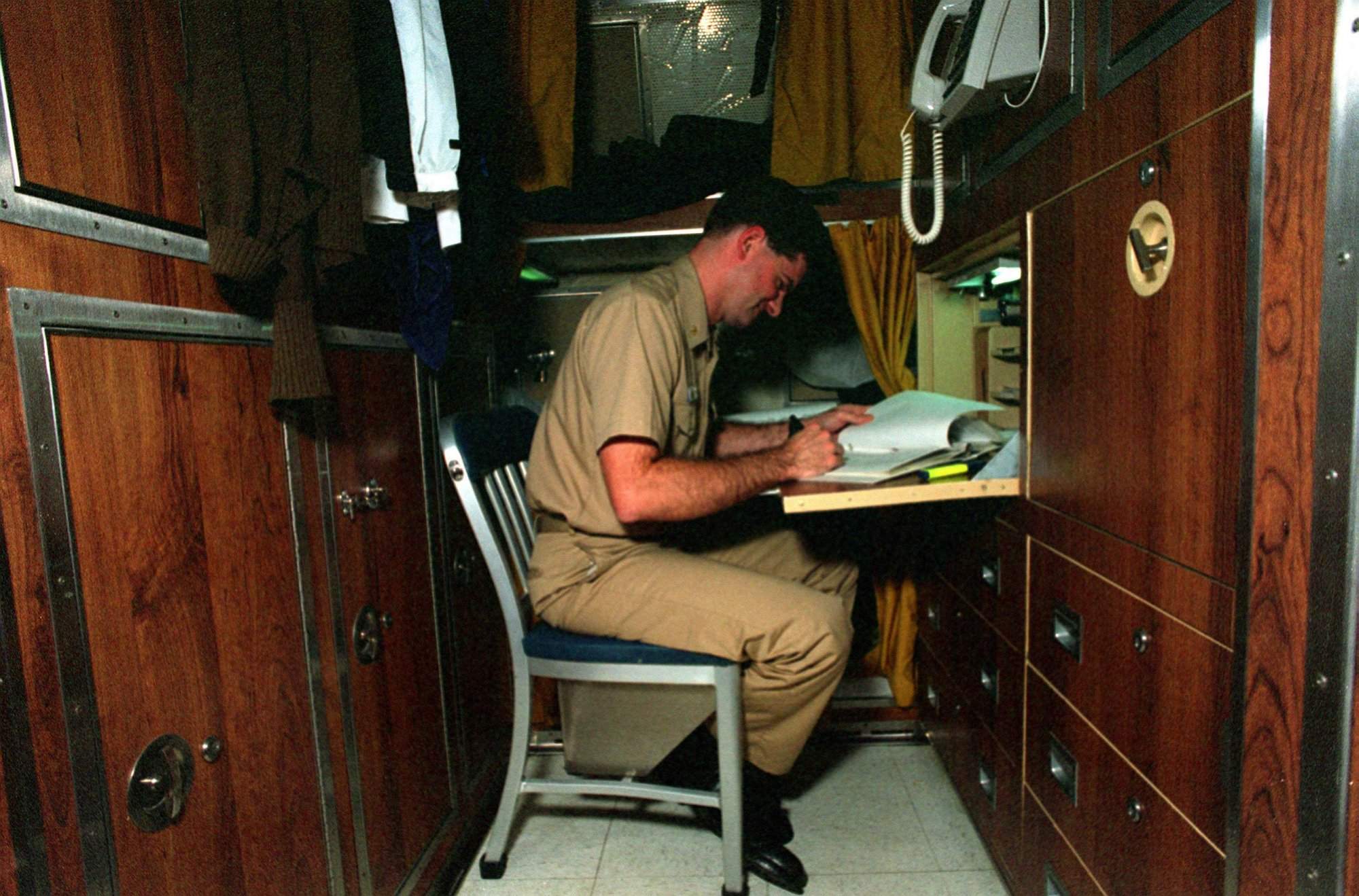 ![]() | 274k | An engineering officer on board the nuclear-powered attack submarine Asheville (SSN-758) goes over some paper work in his state room. | Official USN photo # DN-SC-95-01779 by PH2 Rick Gilmore, courtesy of Newport News Shipbuilding, from the Department of Defense Still Media Collection, courtesy of dodmedia.osd.mil. | |