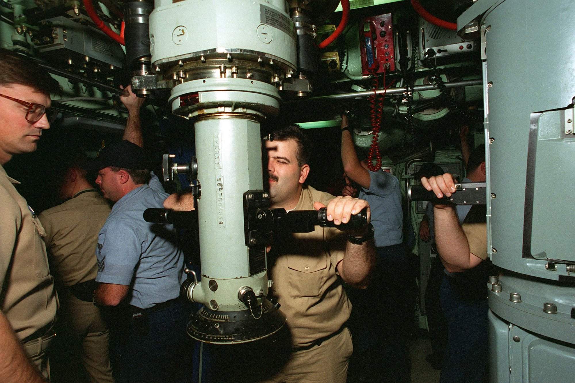 ![]() | 310k | A chief petty officer looks into the number one attack periscope on board the nuclear-powered attack submarine Asheville (SSN-758) on 9 January 1995. The scope to the right is the spotting scope. The Asheville is assigned to Submarine Group Five based at San Diego. | Official USN photo # DN-SC-95-01773 by PH2 Rick Gilmore, courtesy of dodmedia.osd.mil & submitted by Bill Gonyo. | |