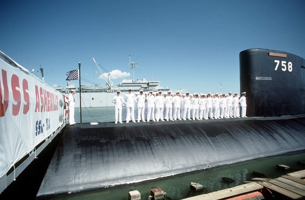 ![]() | 250k | Crew members stand at parade rest aboard the nuclear-powered attack submarine Asheville (SSN-758) as a speaker makes some remarks during the submarine's commissioning ceremony. The submarine tender Emory S. Land (AS-39) is in the background. | Official USN photo # DN-ST-92-00945 by PH2 Rick Gilmore, courtesy of Newport News Shipbuilding, from the Department of Defense Still Media Collection, courtesy of dodmedia.osd.mil. | |