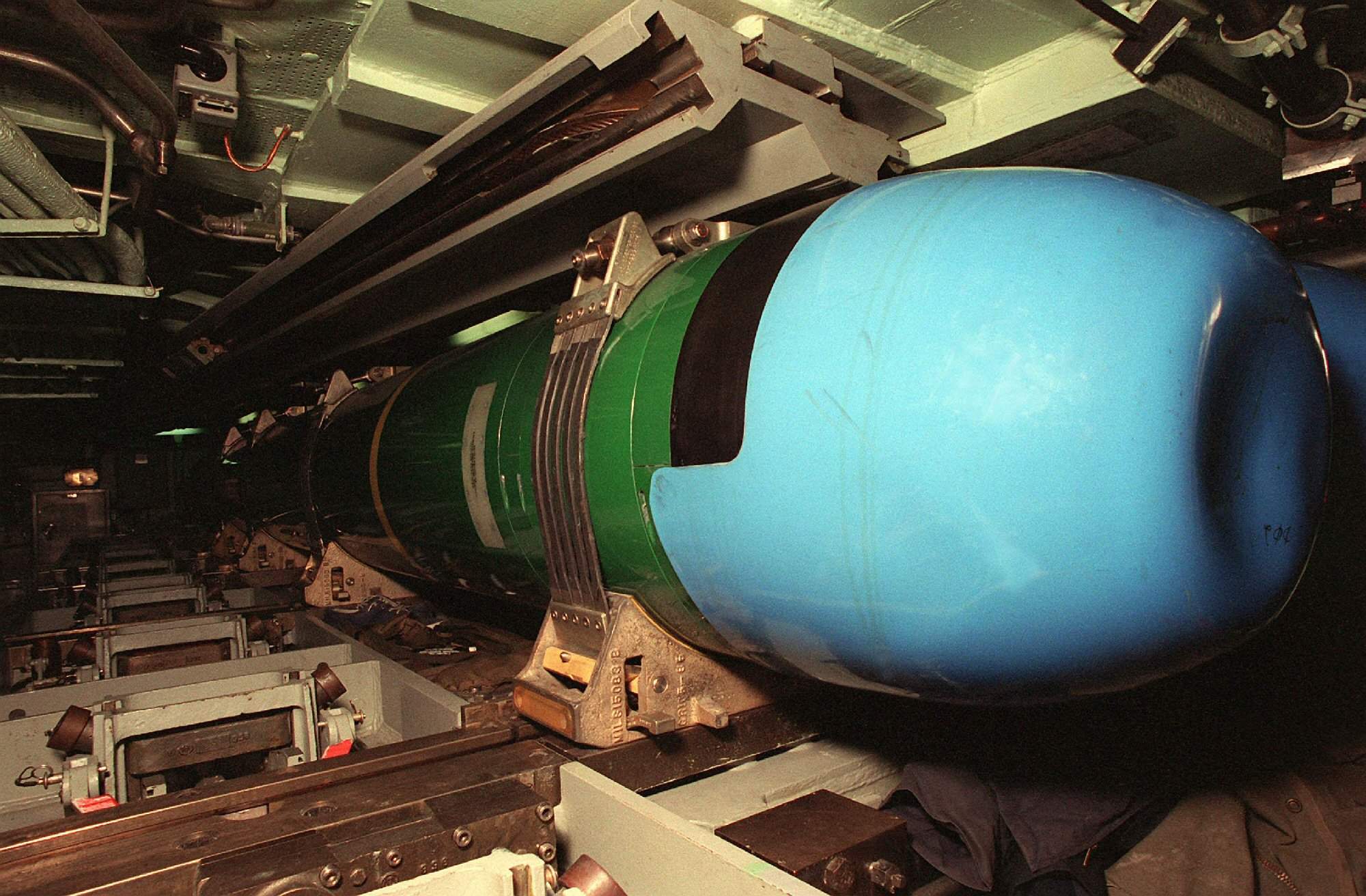 ![]() | 301k | A Mark 48 advanced capabilitytorpedo in a storage rack in the torpedo room of the nuclear-powered attack submarine Asheville (SSN-758) on 9 January 1995. | Official USN photo # DN-SC-95-01775 by PH2 Rick Gilmore, from the Department of Defense Still Media Collection, courtesy of dodmedia.osd.mil. | |