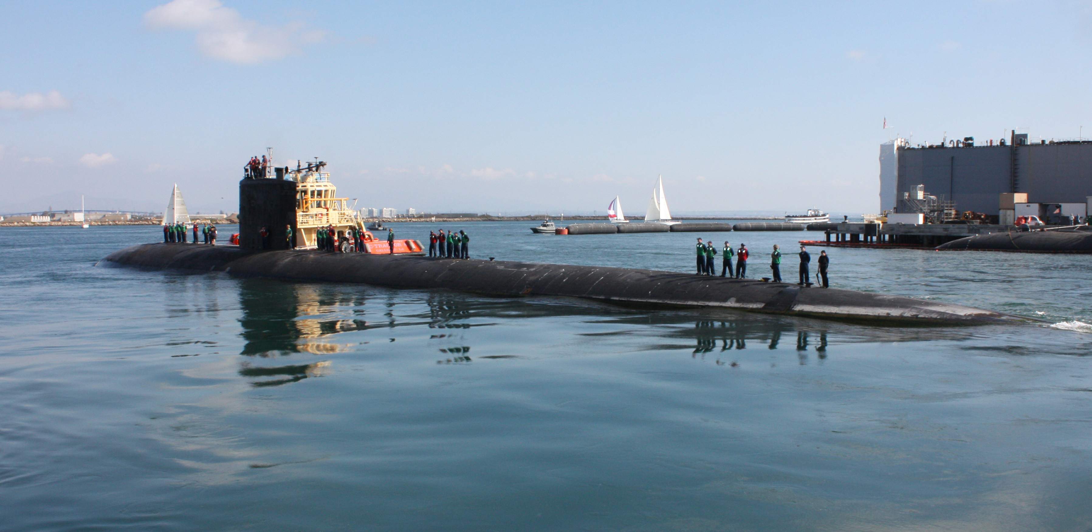 ![]() | 192k | Assisted by a tugboat, Asheville (SSN-758) pulls into her berth at Naval Submarine Base Point Loma, 15 July 2003, after completing post-overhaul sea trials. Asheville completed her homeport change to San Diego after a two-year overhaul at Puget Sound Naval Shipyard. | USN photo # N-6426C-001 by Journalist 2nd Class James E. Christopher, courtesy of news.navy.mil. Partial text courtesy of Jon Rains. | |