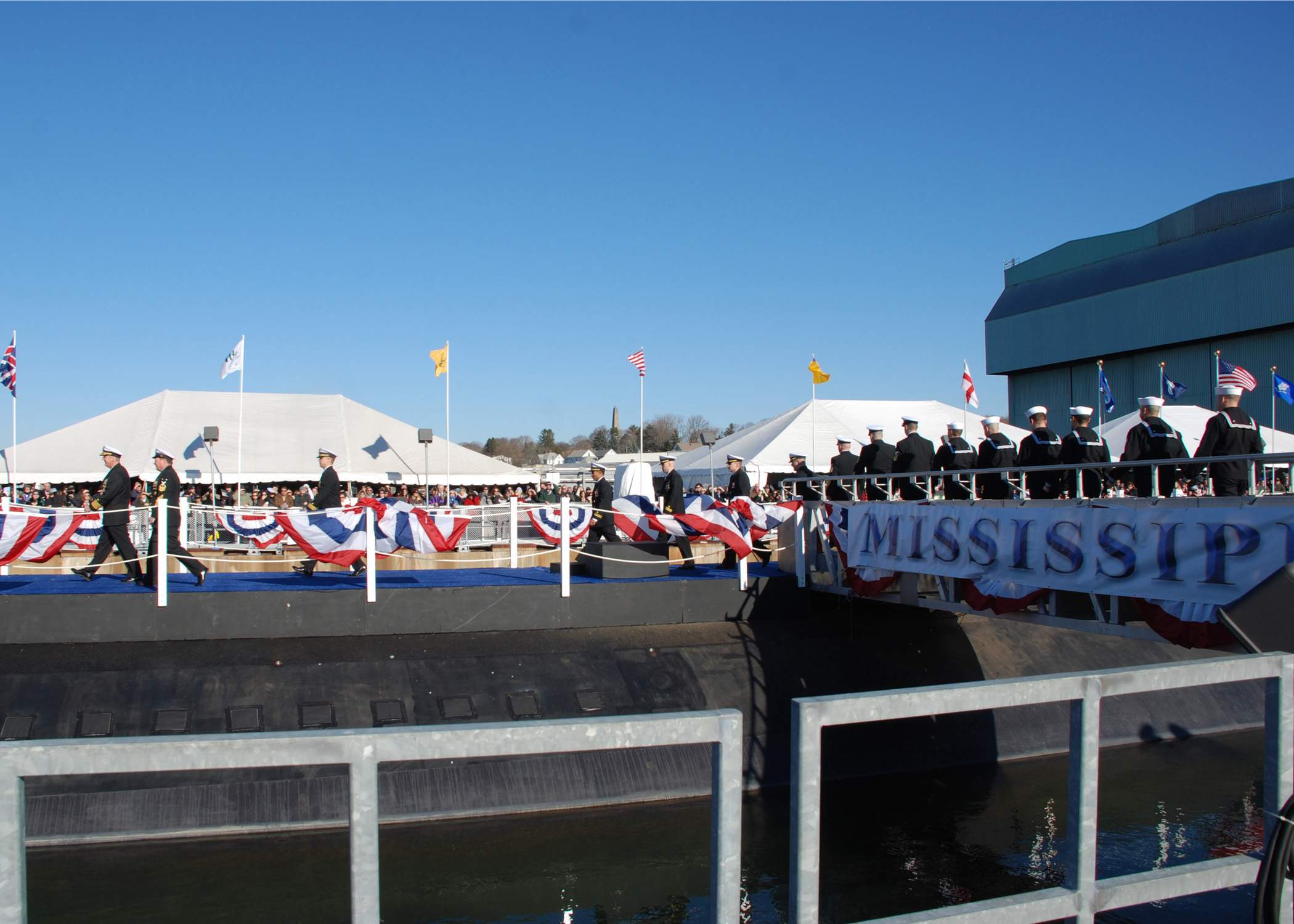![]() | 514k | Sailors assigned to the Virginia-class attack submarine Pre-Commissioning Unit (PCU) Mississippi (SSN-782) file off the ship after it was christened by ship sponsor Allison Stiller during a ceremony at the General Dynamics Electric Boat shipyard. | USN photo # N-UM744-004 by John Narewski via navy.news.mil. | |