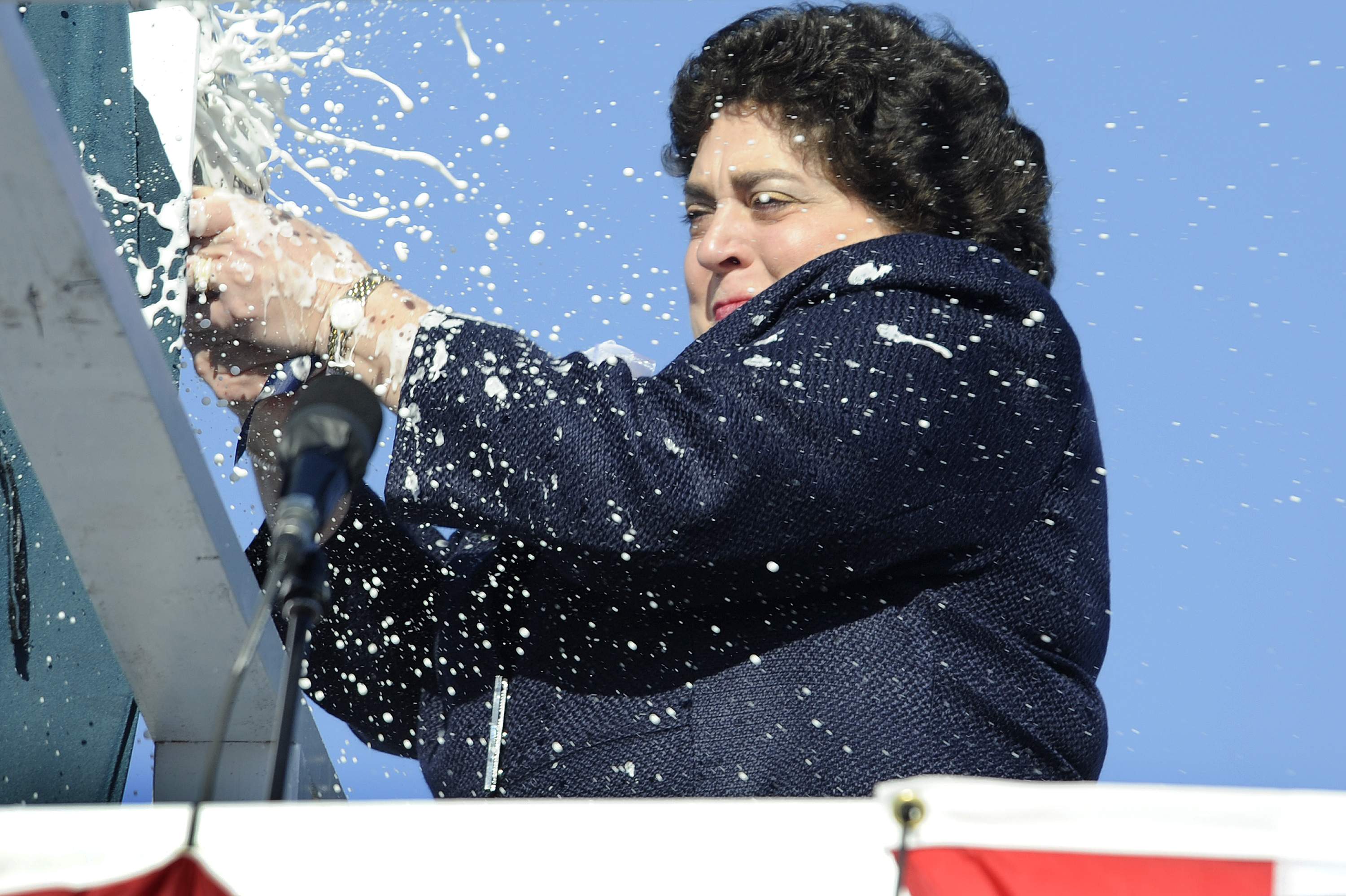 ![]() | 487k | Ship sponsor Allison Stiller christens the attack submarine Pre-Commissioning Unit (PCU) Mississippi (SSN-782) during a ceremony at the General Dynamics Electric Boat shipyard. | USN photo # N-UM744-003 by John Narewski via navy.news.mil. | |
