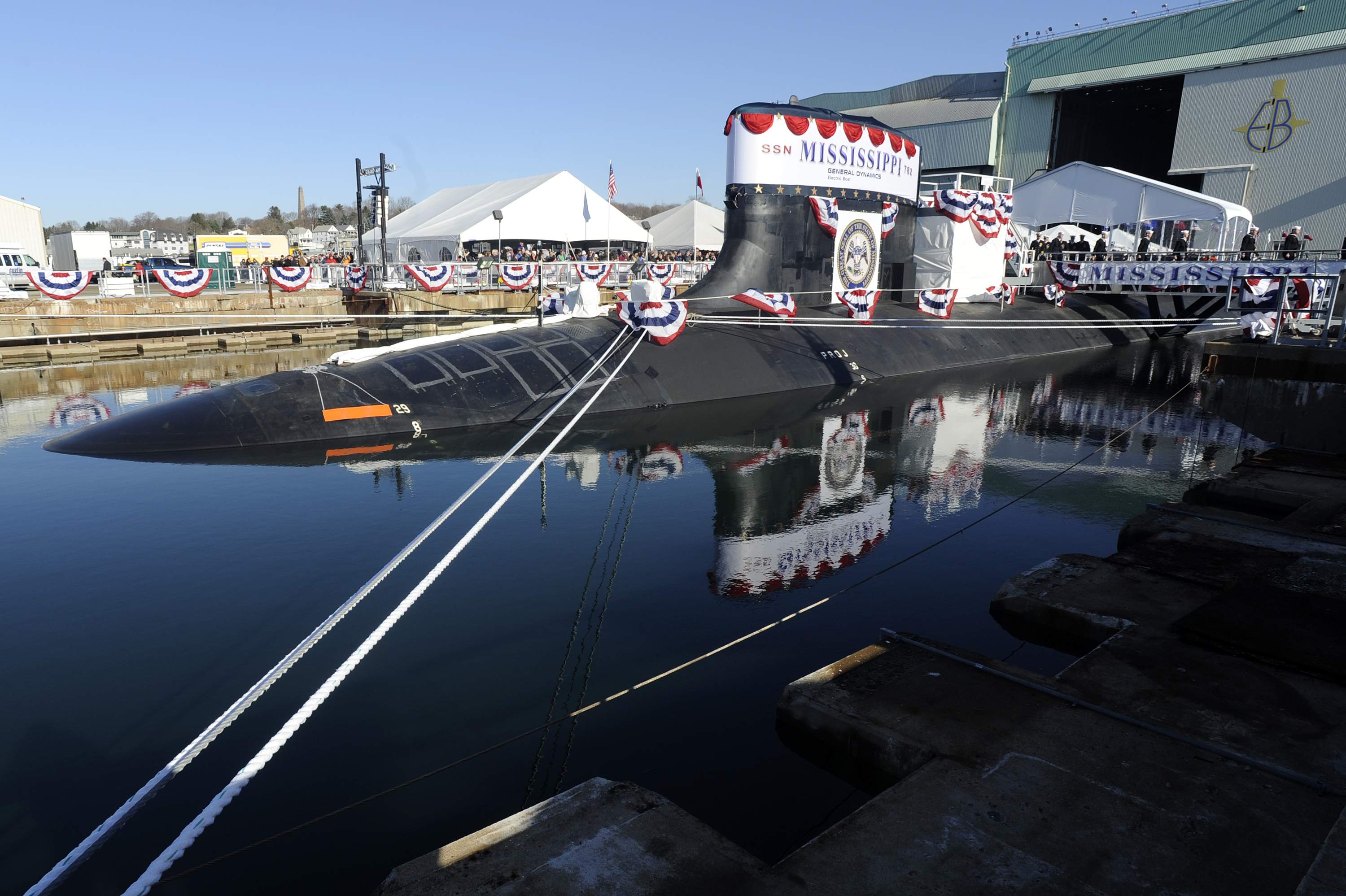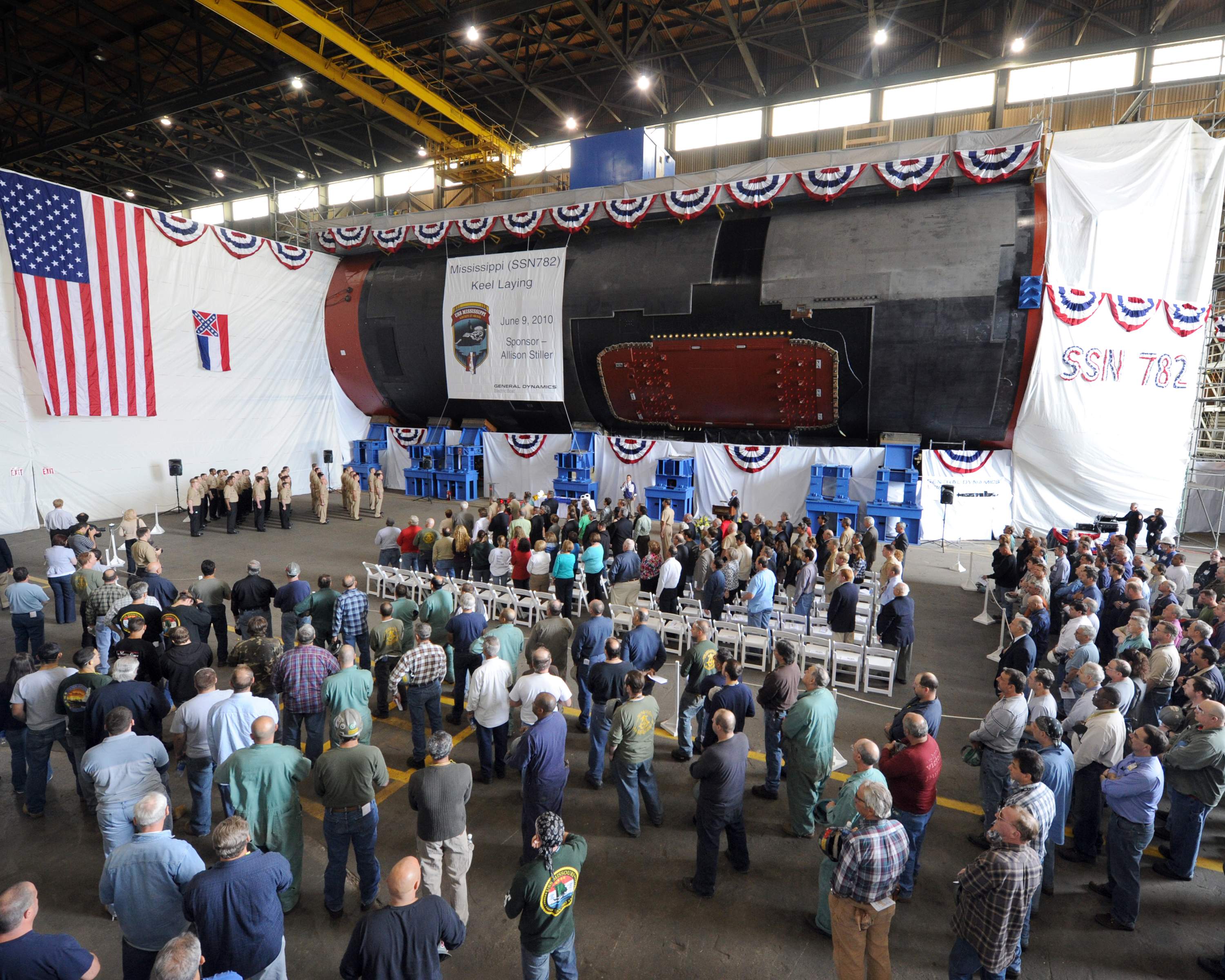 ![]() | 780k | Attendees gather at General Dynamics Electric Boat Quonset Point facility for the keel-laying ceremony of the attack submarine Pre-Commissioning Unit (PCU) Mississippi (SSN-782) on 9 June 2010. | USN photo # O-3913D-013 courtesy of General Dynamics Electric Boat via navy.news.mil. | |