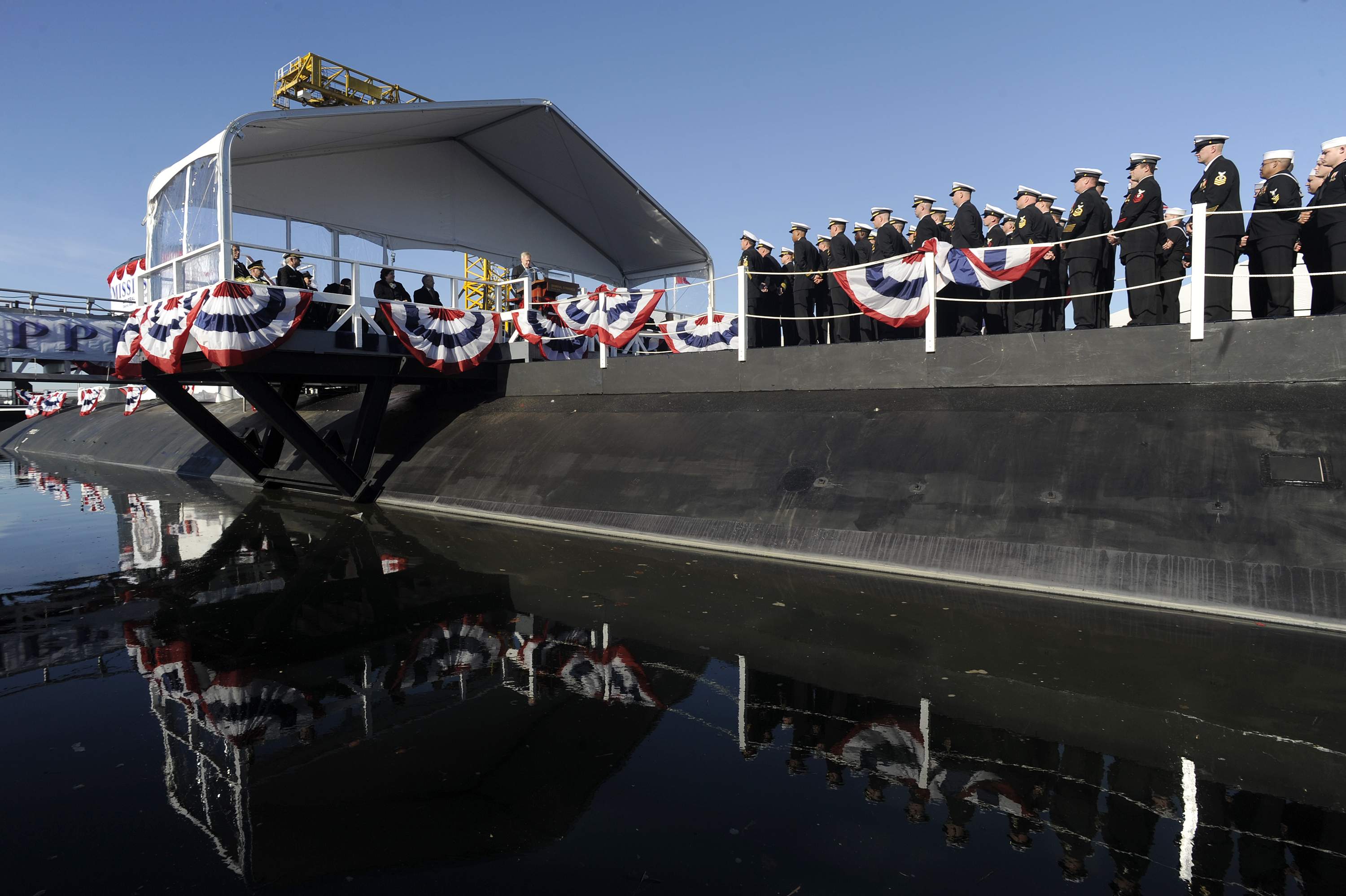 ![]() | 423k | Sailors assigned to the attack submarine Pre-Commissioning Unit (PCU) Mississippi (SSN-782) look on as Secretary of the Navy the Honorable Ray Mabus delivers the keynote address at the ship's christening ceremony. | USN photo # N-UM744-001 by John Narewski via navy.news.mil. | |