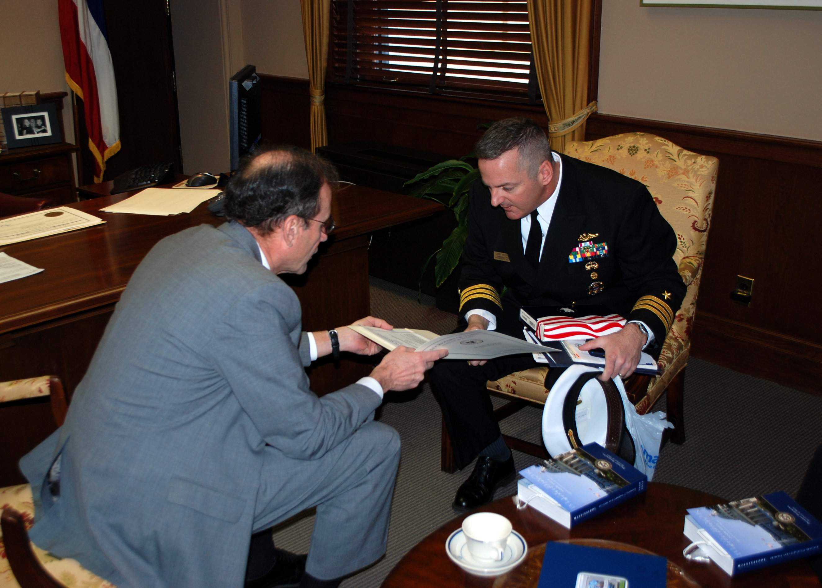 ![]() | 316k | Mississippi Secretary of State Delbert Hosemann, left, presents a state flag that was flown over the capitol building and a book about the state to Commander John McGrath, Officer-in-Charge of the PCU Mississippi (SSN-782) in Jackson Miss. on 18 February, 2010. | USN photo # N-8750E-131 by Lt. Patrick Evans, courtesy of navy.news.mil. | |