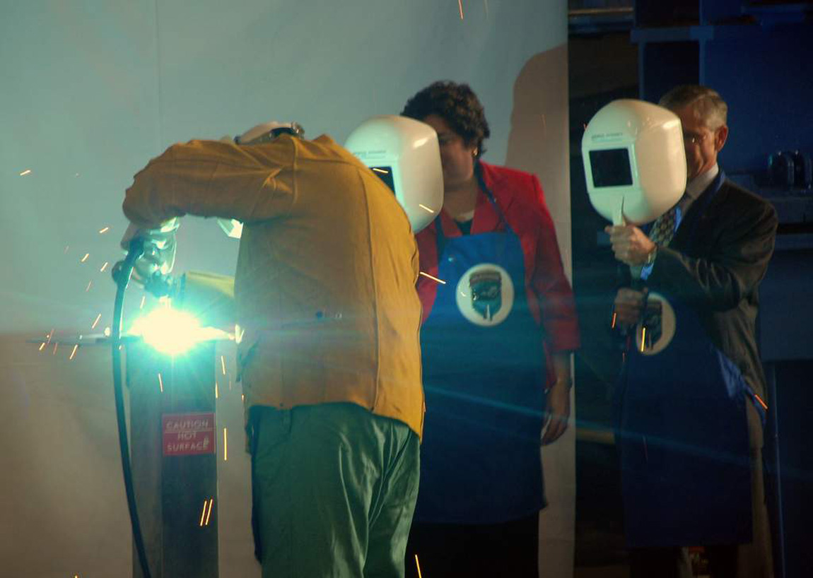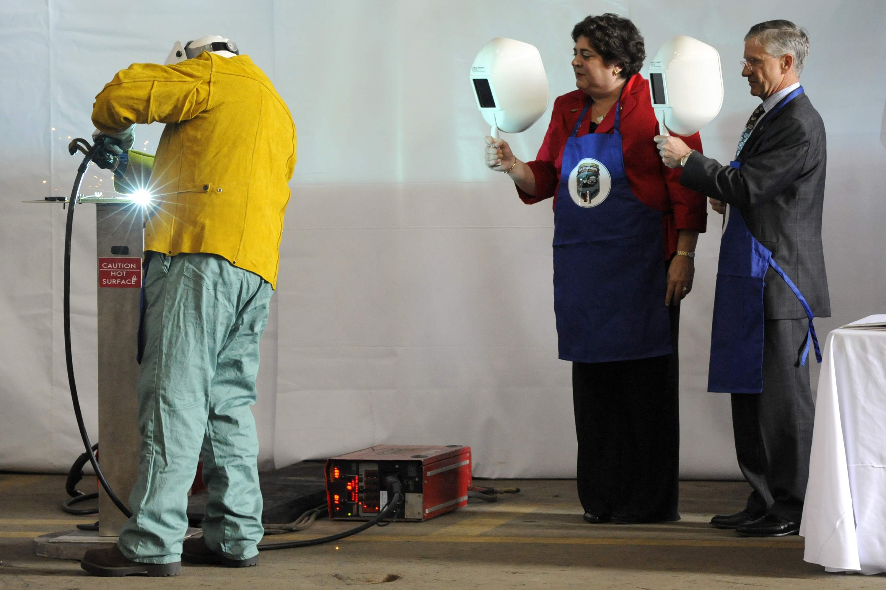 ![]() | 369k | Allison Stiller and John Casey look on as welder Scott Fanning inscribes Stiller's initials onto a metal plate. | Photo # N-8467N-001 courtesy of General Dynamics Electric Boat via navy.news.mil. | |