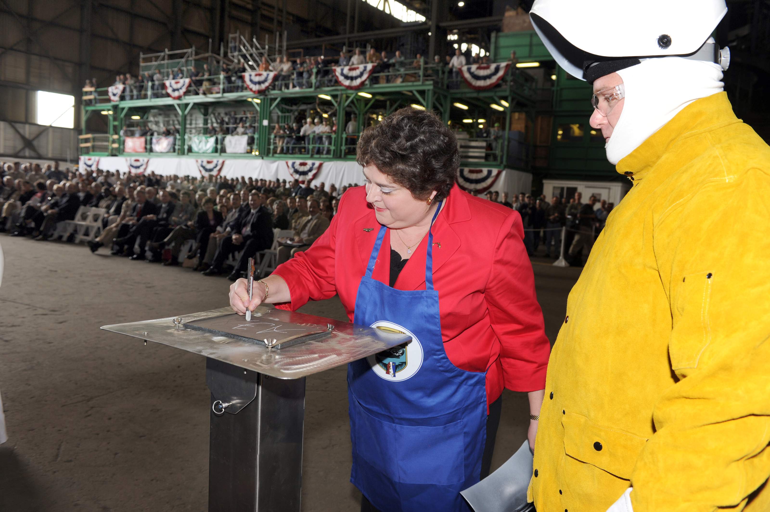 ![]() | 460k | Allison Stiller, Deputy Assistant Secretary of the Navy for Ship Programs, writes her initial on a metal plate that welder Scott Fanning will inscribe during a keel-laying ceremony for the attack submarine Pre-Commissioning Unit (PCU) Mississippi (SSN-782) at General Dynamics Electric Boat Quonset Point facility on 9 June 2010. Fanning will weld the plate to the ship during the ceremony. Stiller is the ship's sponsor. | USN photo # O-3913D-012 by Electronics Technicians 2nd Class Mark Moore via navy.news.mil. | |