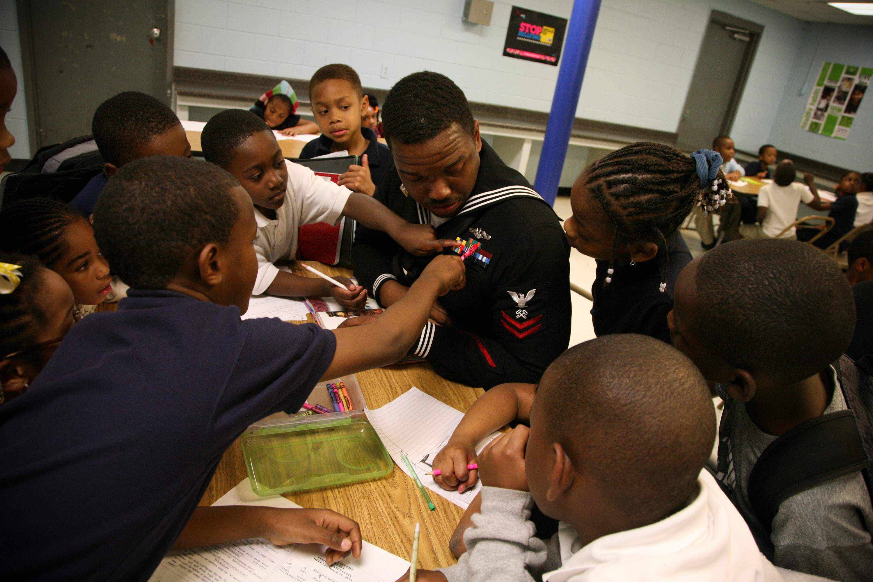 ![]() | 487k | Logistics Specialist 2nd Class Darrius Jenkins, assigned to the pre-commissioning unit of the attack submarine Mississippi (SSN-782) speaks with children at Central Mississippi Boys and Girls Club during Mississippi Navy Week, one of 21 Navy Weeks planned across America for 2011. Navy Weeks are designed to showcase the investment Americans have made in their Navy as a global force for good and increase awareness in cities that do not have a significant Navy presence. | USN photo # N-YM440-425 by Senior Chief Mass Communication Specialist Gary Ward. | |