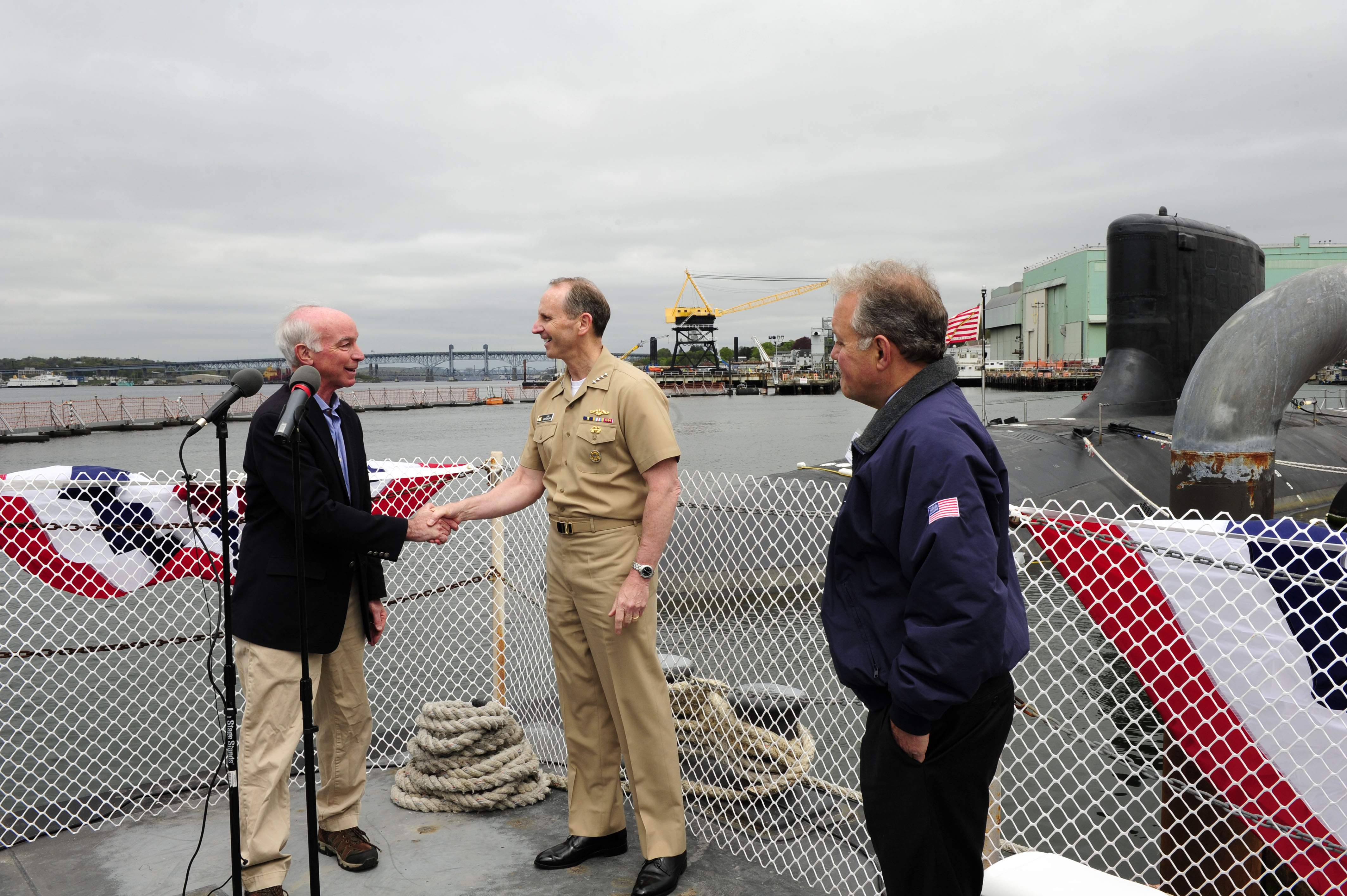 ![]() | 1.07k | Chief of Naval Operations (CNO) Adm. Jonathan Greenert shakes hands with U.S. Rep. Joe Courtney from Connecticut during a press conference 2 May 2012 at the General Dynamics Electric Boat shipyard to announce the Navy's acceptance of the Pre-Commissioning Unit (PCU) Mississippi (SSN-782) and answer questions from national and local media. | USN photo # N-WL435-254 by Mass Communication Specialist 1st Class Peter D. Lawlor via navy.news.mil courtesy of Ron Reeves (of blessed memory). | |