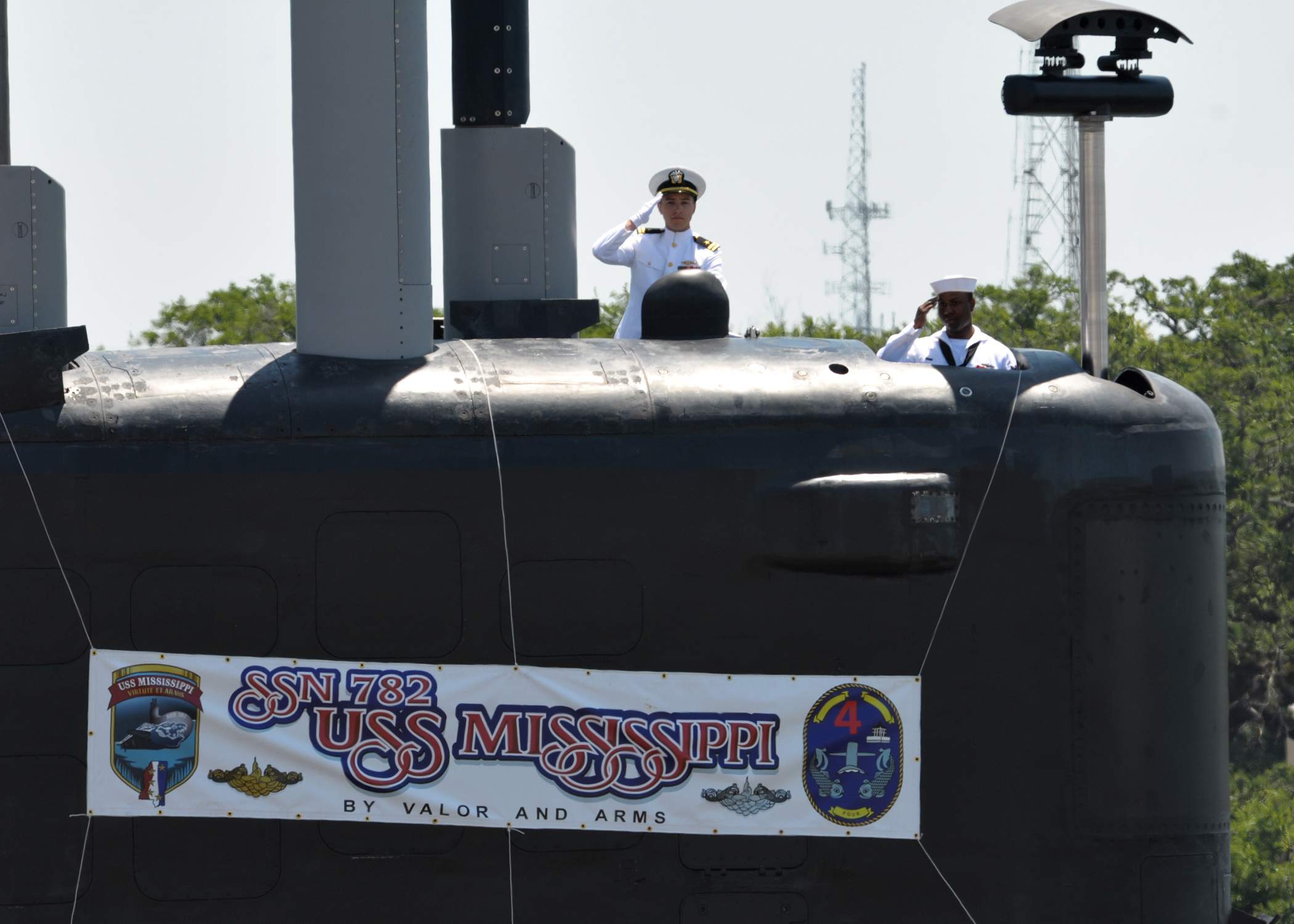 ![]() | 604k | Sailors assigned to the attack submarine Mississippi (SSN-782) render a salute during the commissioning ceremony for the Navy's ninth Virginia-class attack submarine. | USN photo # N-GO025-301 courtesy of Mass Communication Specialist 1st Class W.B. Swoboda via navy.news.mil. | |
