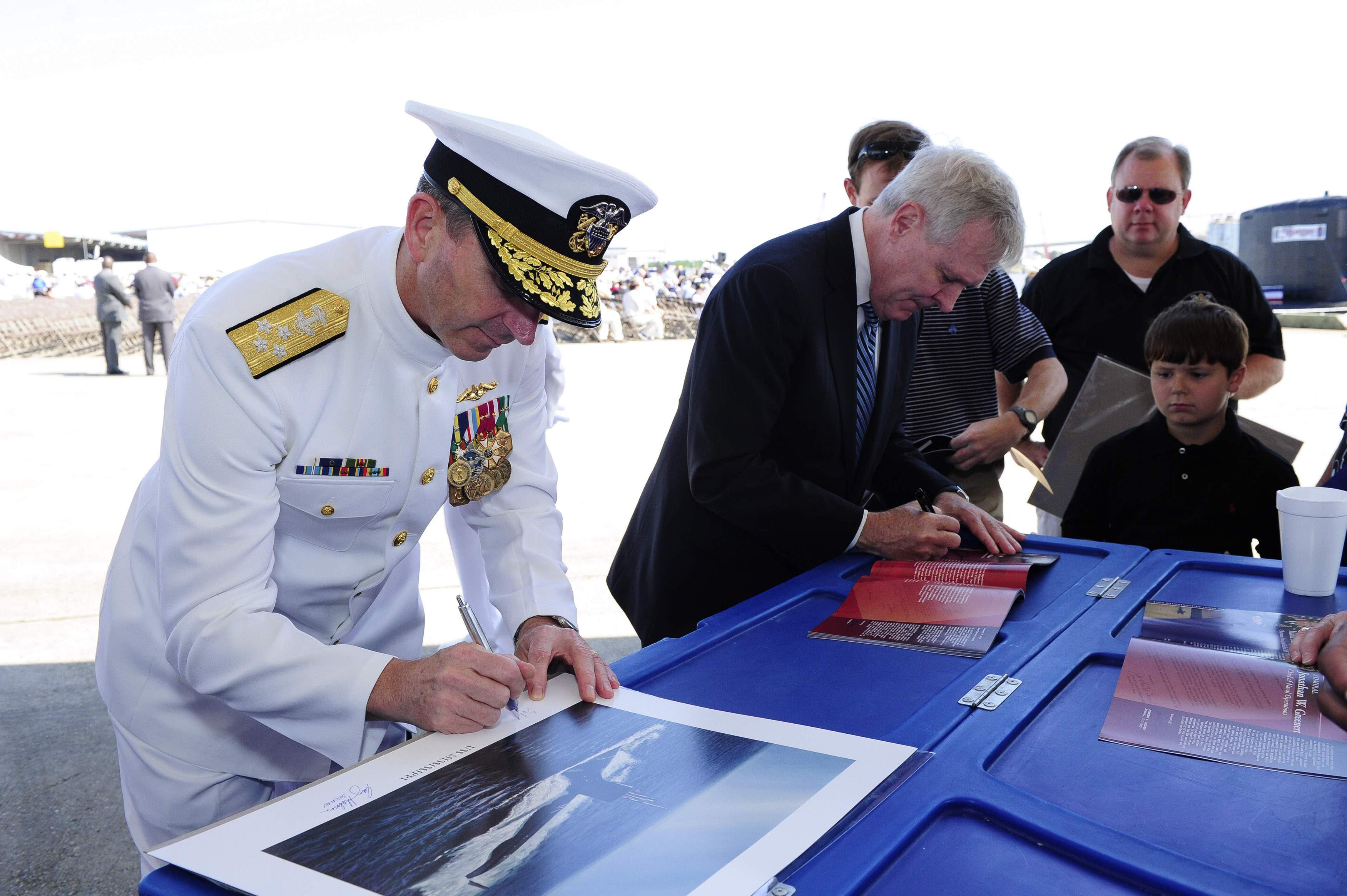 ![]() | 604k | Chief of Naval Operations (CNO) Adm. Jonathan Greenert left, and Secretary of the Navy (SECNAV) the Honorable Ray Mabus sign photos before the commissioning ceremony for the attack submarine Mississippi (SSN-782). | USN photo # N-WL435-122 courtesy of Mass Communication Specialist 1st Class Peter D. Lawlor via navy.news.mil. | |