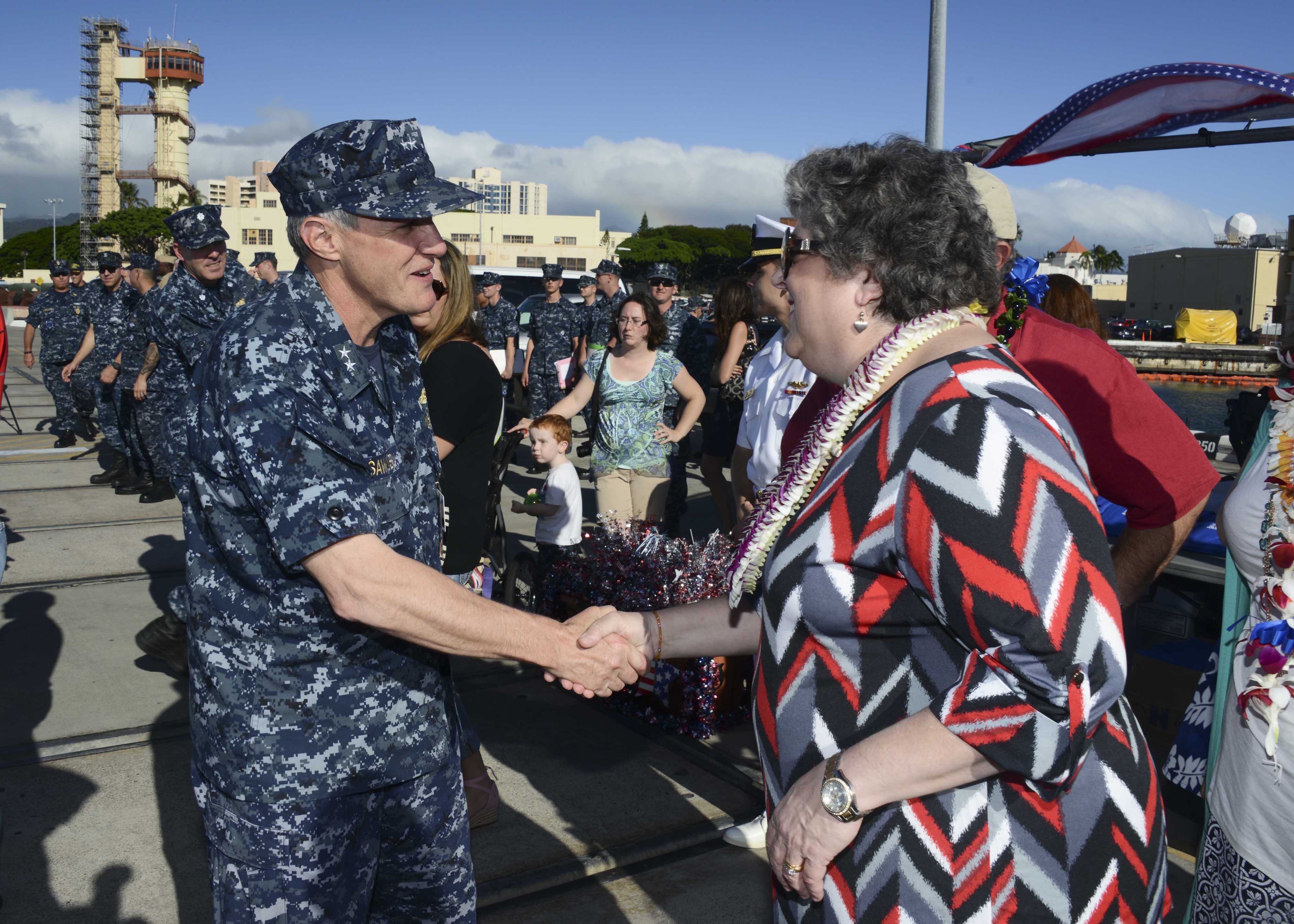 ![]() | 736k | Rear Adm. Phil Sawyer, commander of Submarine Force, U.S. Pacific Fleet, greets Allison Stiller, deputy assistant secretary of the Navy for ship programs and ship sponsor of the Mississippi (SSN-782), during an arrival ceremony 25 November 2014 as Mississippi is welcomed to its new homeport at Joint Base Pearl Harbor-Hickam. Mississippi is the 4th Virginia-class submarine to be home ported in Pearl Harbor, and one of 18 attack submarines permanently homeported at the historic base. | USN photo # 141125-N-DB801-177 by Mass Communication Specialist 1st Class Steven Khor via navy.news.mil. | |
