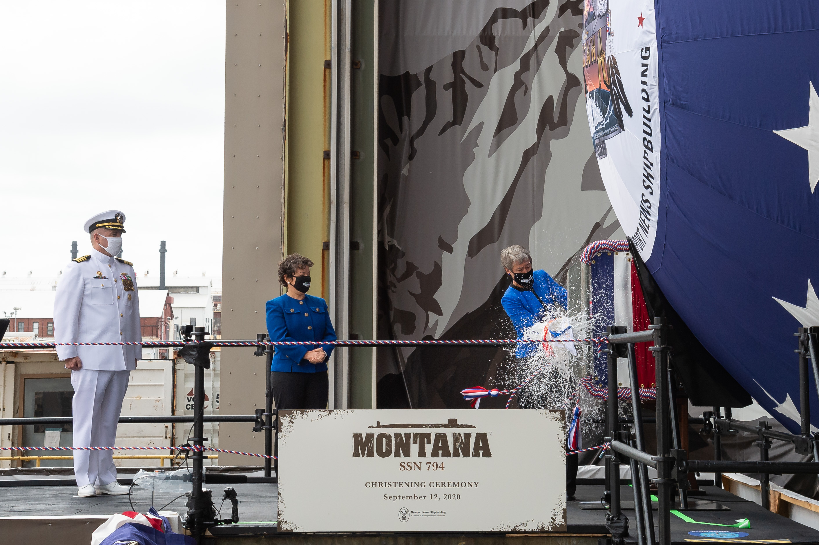 0879407 | 1.21k | With one solid swing, the ship's sponsor, former Secretary of the Interior Sally Jewell christened the Montana (SSN-794) as (from left) the ship's commanding officer Capt. Michael Delaney and Newport News Shipbuilding President Jennifer Boykin look on, 12 September, 2020. | Photo # DCS20-352-367 by Matt Hildreth courtesy of nns.huntingtoningalls.com..