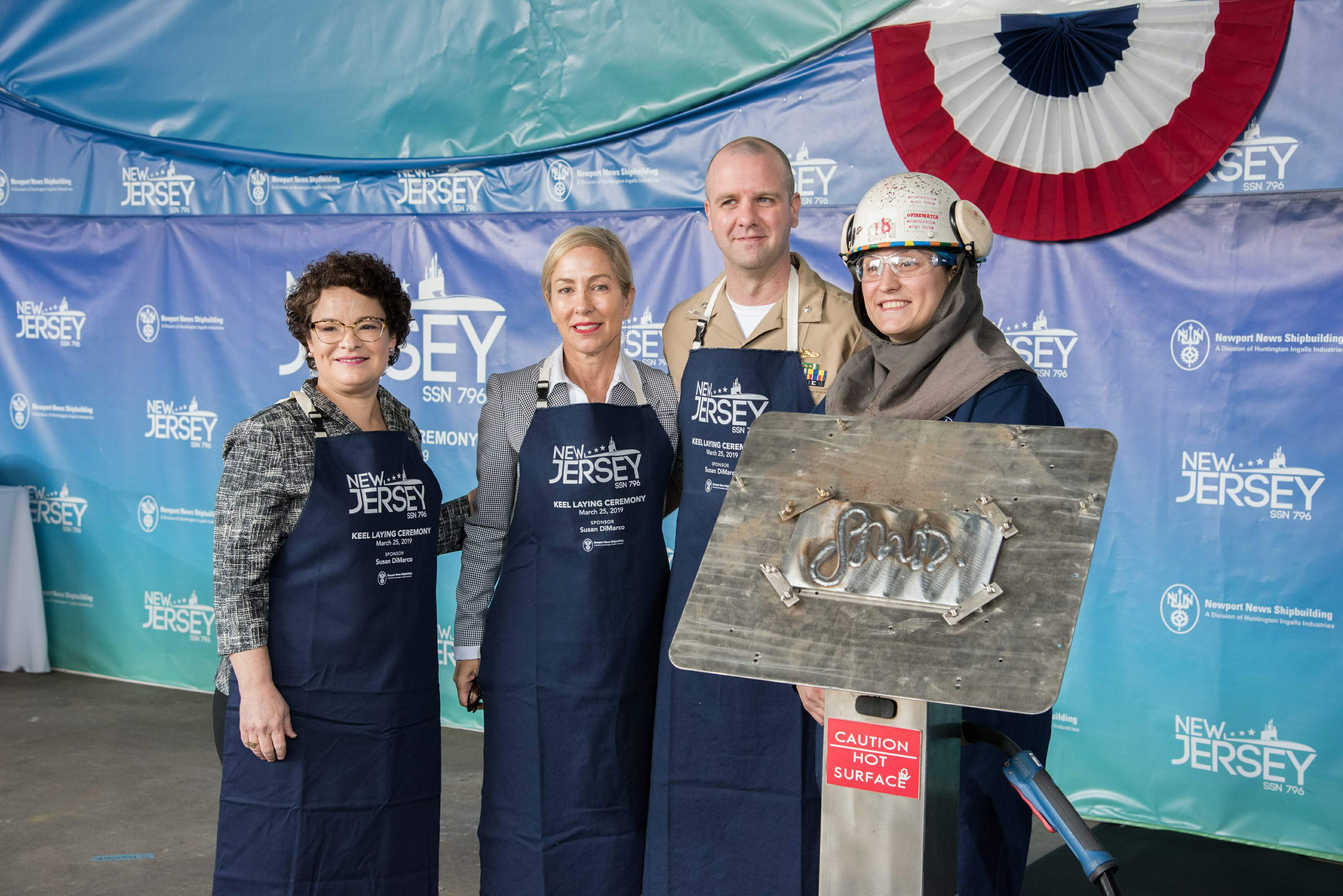 ![]() | 684k | Jess Batruk, a Newport News Shipbuilding welder originally from New Jersey, displays the welded initials of Susan DiMarco, the sponsor of submarine New Jersey (SSN-796). Also pictured (left to right) are Jennifer Boykin, president of Newport News Shipbuilding; DiMarco; and Cmdr. Joseph Spinks, the submarine's commanding officer. | Photo # DCS19-155-279 by Ashley Cowan/HII, courtesy of Huntington Ingalls Industries. | |