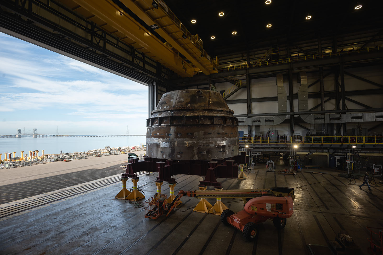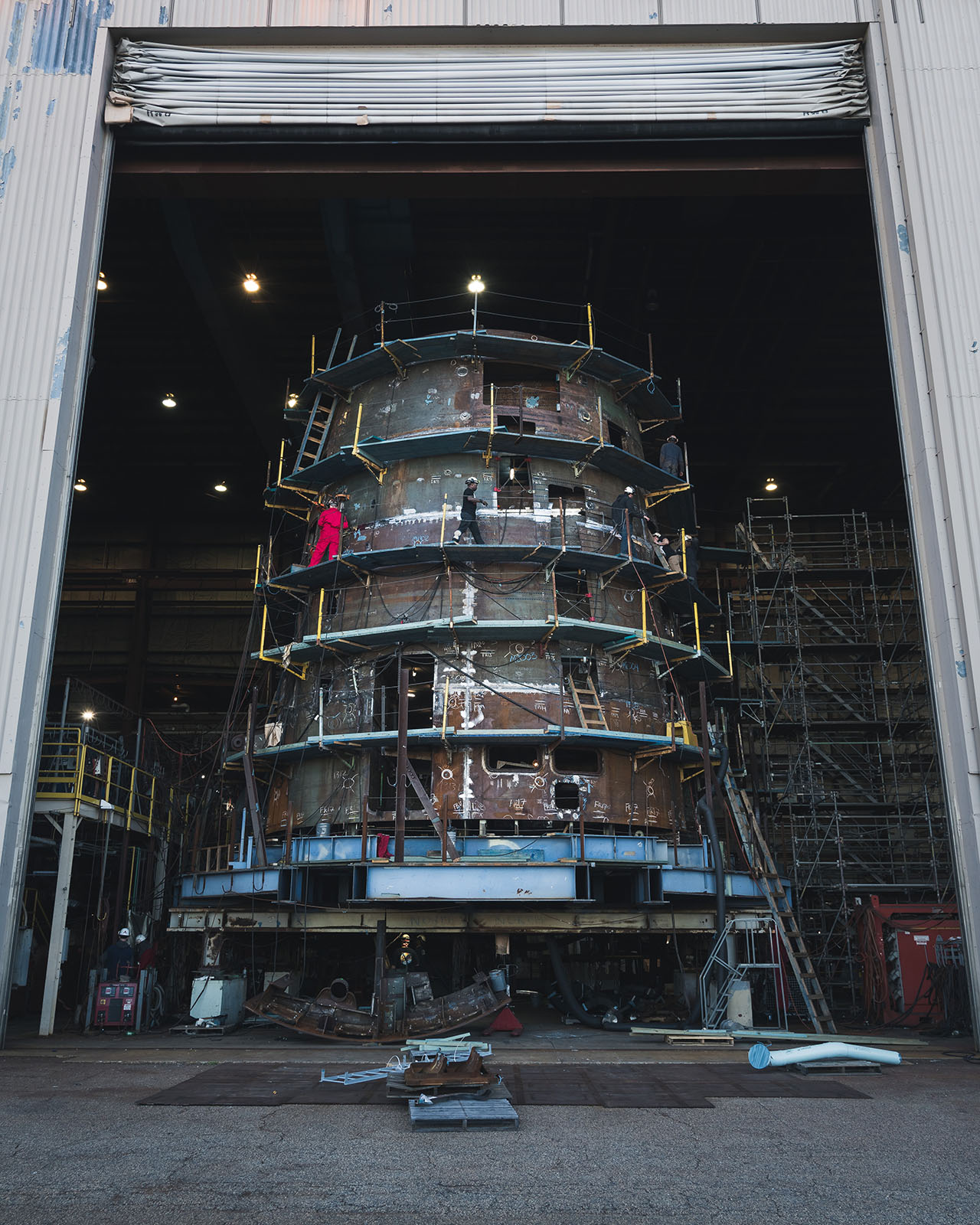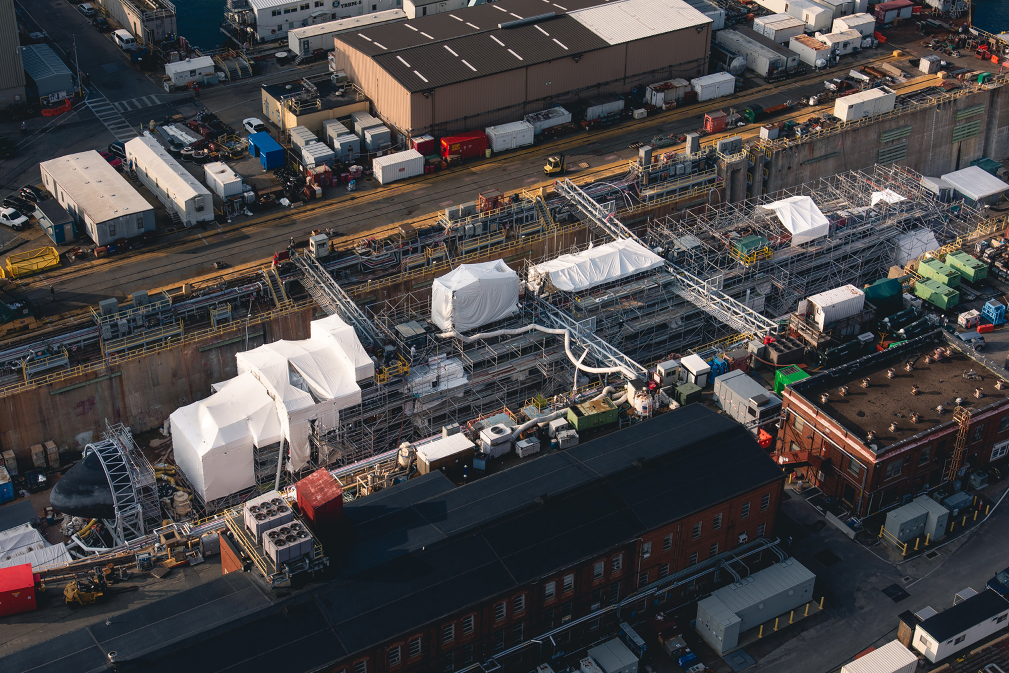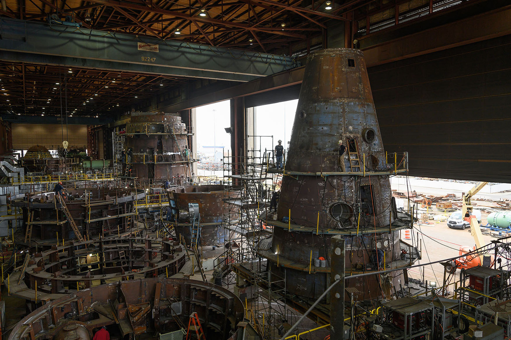 ![]() | 325k | A unique view of stage boards and safety rails surrounding a submarine unit in the Ring Module Shop, May 2019. This photo is not identified as any particular Virginia-class submarine by NNS and it is generic). | Photo # 5-DCS18-690-29 by Matt Hildreth courtesy of nns.huntingtoningalls.com | |