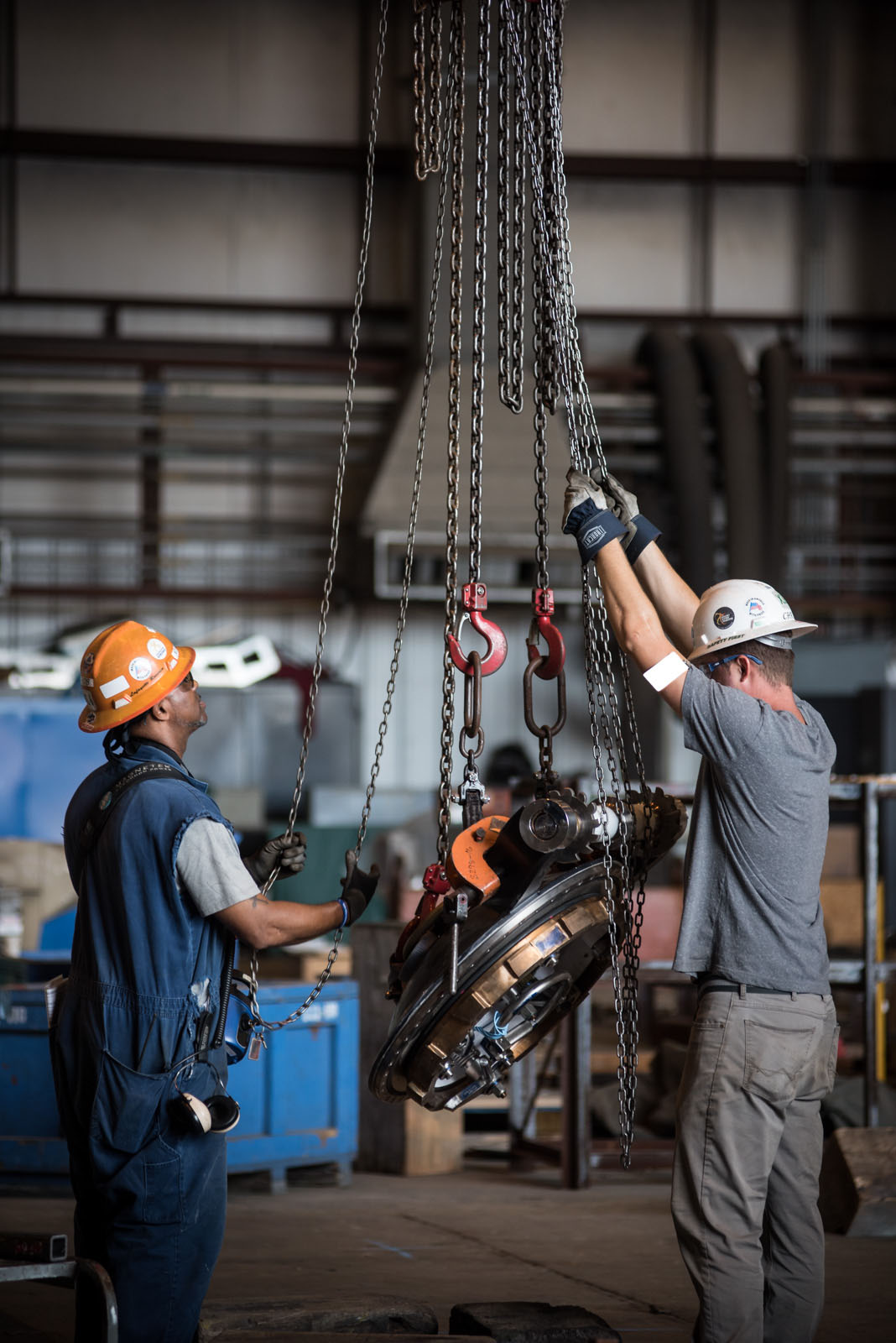 ![]() | 282k | Shipbuilders Rob Roberson and Chris Parrish pull chains to lift a submarine hatch cover off the ground, November 2017. (This is not identified as any particular Virginia-class submarine by NNS and it is generic). | Photo # 3-DCS17-571-21 by Ashley Cowan courtesy of nns.huntingtoningalls.com | |