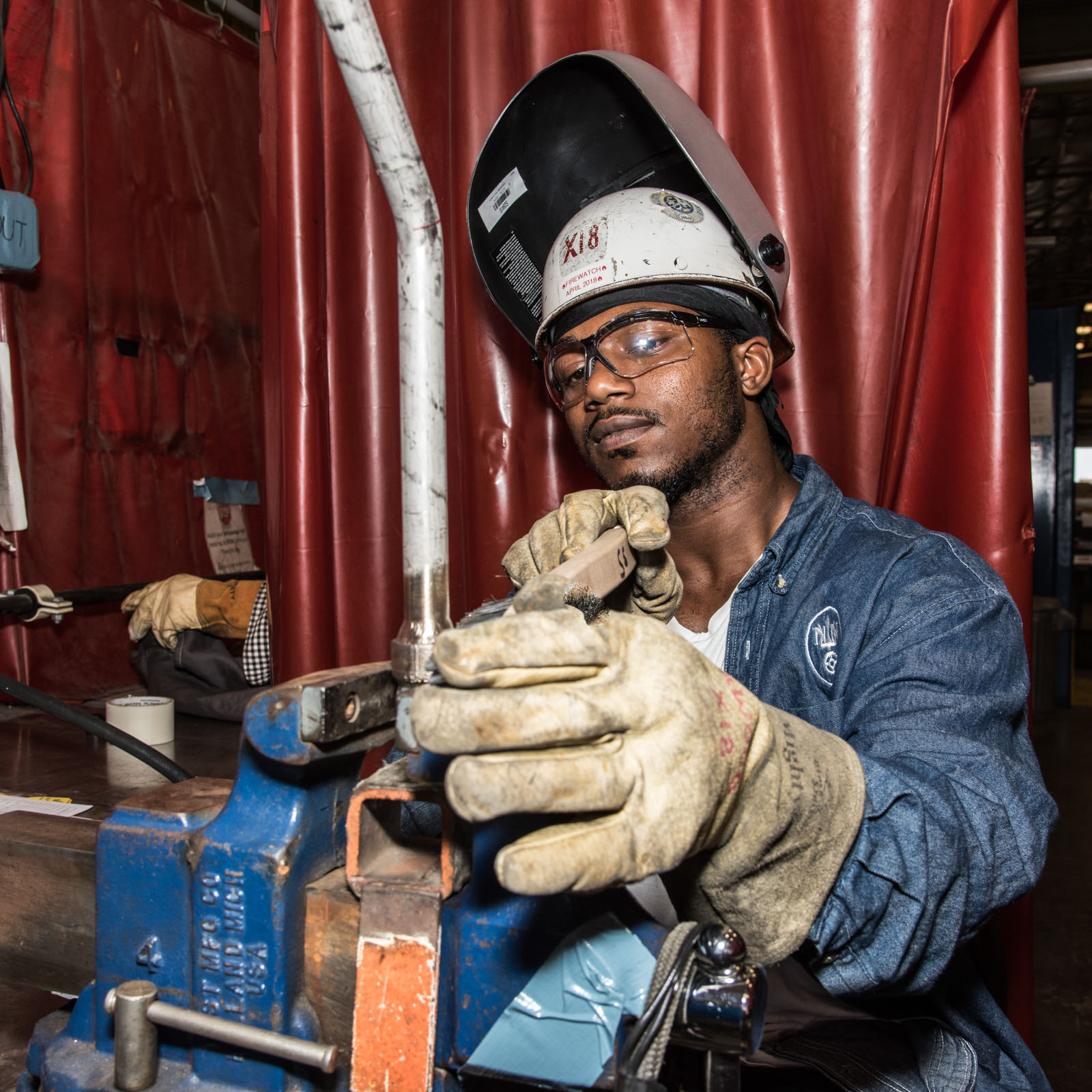 ![]() | 420k | Shipbuilder Jouis Norwood cleans a weld in the Submarine Frame Shop, September 2017. (This is not identified as any particular Virginia-class submarine by NNS and it is generic). | Photo # 5-DCS17-286-206 by Ashley Cowan courtesy of nns.huntingtoningalls.com | |