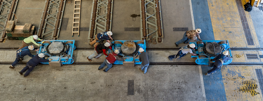 ![]() | 239k | Riggers push "little blue cars" along a track in the Modular Outfitting Facility, which link together to transport large submarine modules, March 2014. (This is not identified as any particular Virginia-class submarine by NNS and it is generic). | Photo # DCS14-82-34 by Chris Oxley, courtesy of nns.huntingtoningalls.com | |