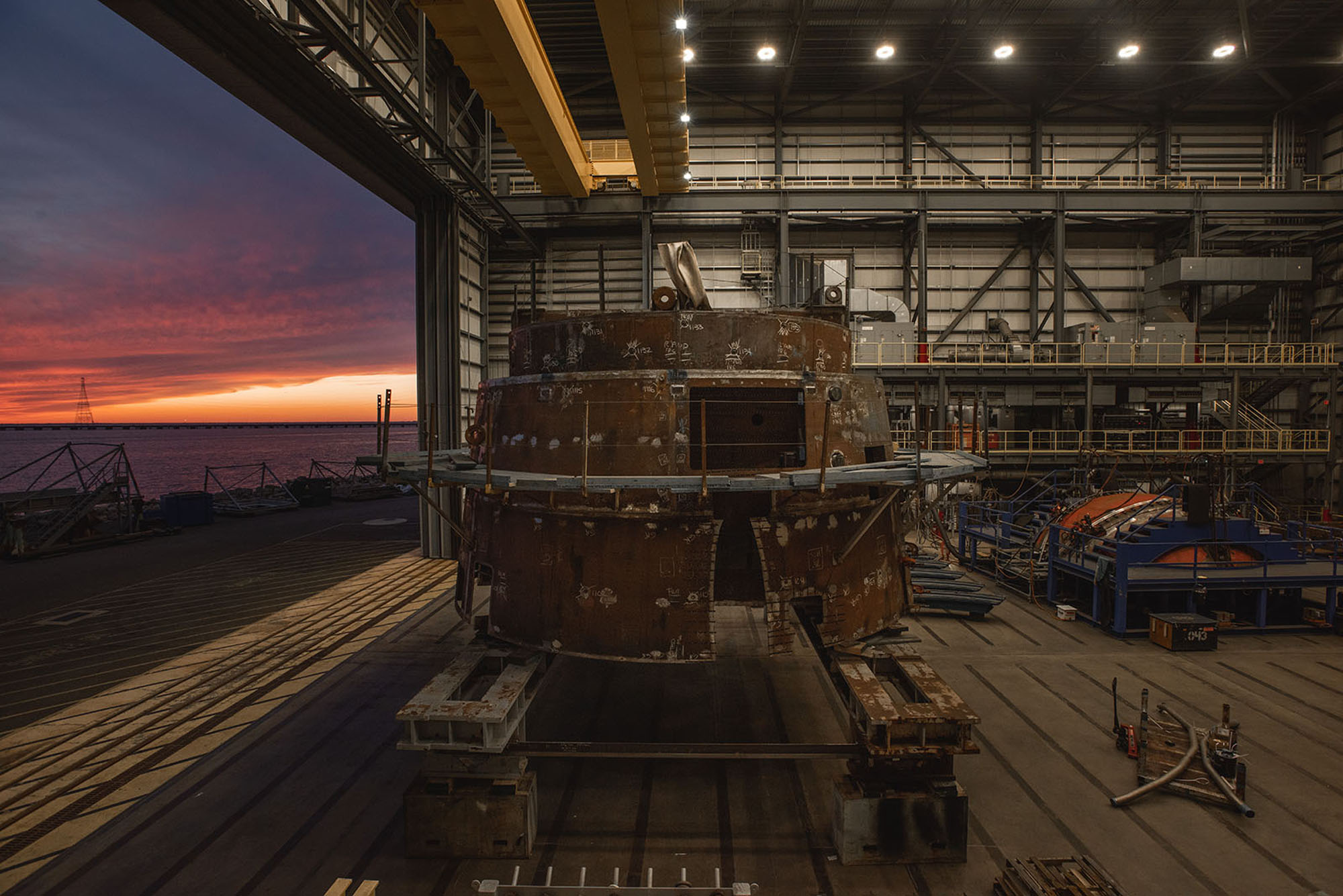 ![]() 0879800k | 412k | Submarine construction continues as a colorful sky closes out the day, July 2020. (This is not identified as any particular Virginia-class submarine by NNS and it is generic). | Photo # 5-DCS20-145-75 by Matt Hildreth, courtesy of nns.huntingtoningalls.com | |