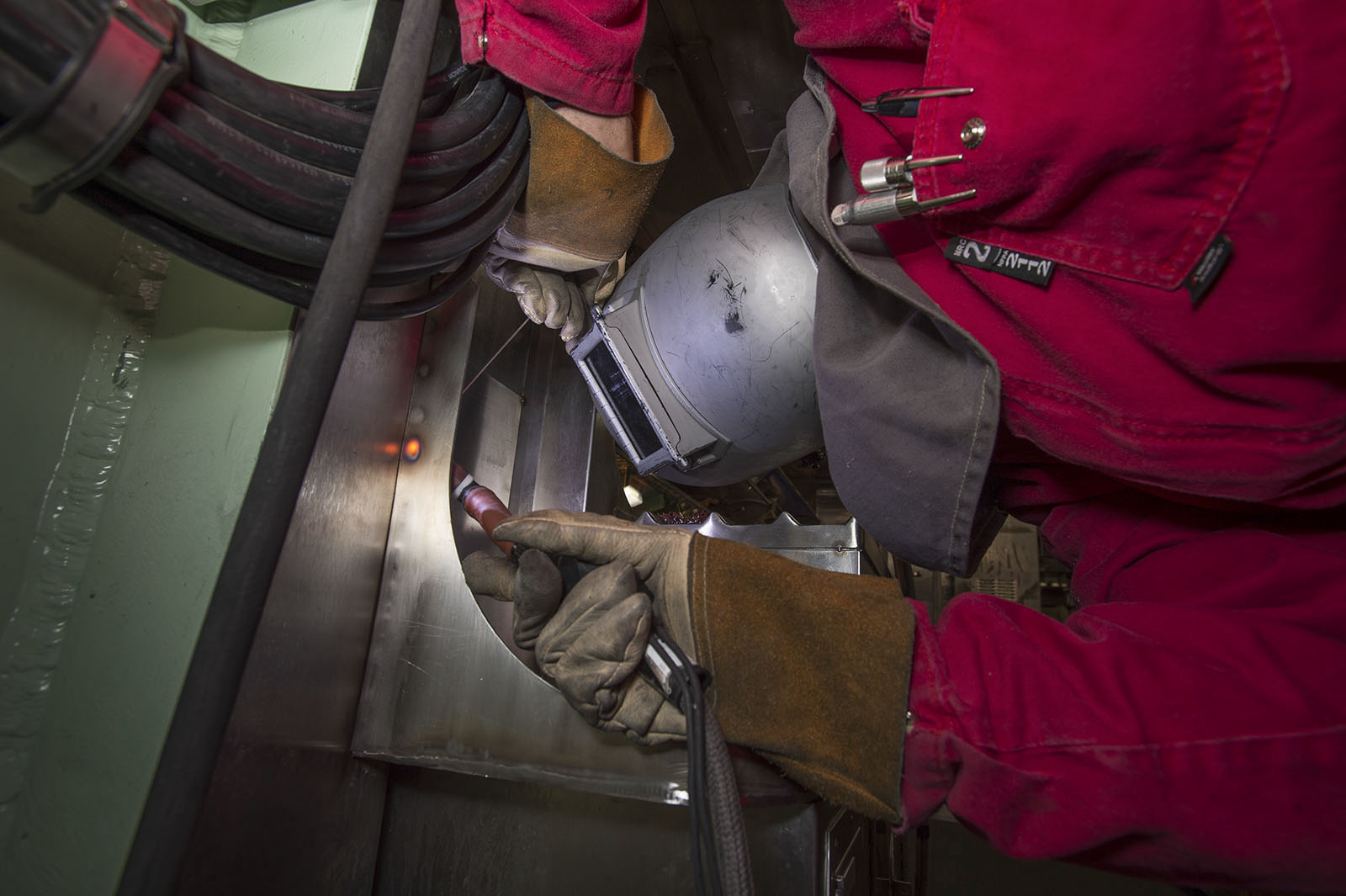 ![]() | 204k | TIG welding in a Virginia-class submarine puts welder Michael Tyler in some tight spots, June 2016. This photo is not identified as any particular Virginia-class submarine by NNS and it is generic). | Photo # 6-DCS16-63-46 by John Whalen, courtesy of nns.huntingtoningalls.com | |