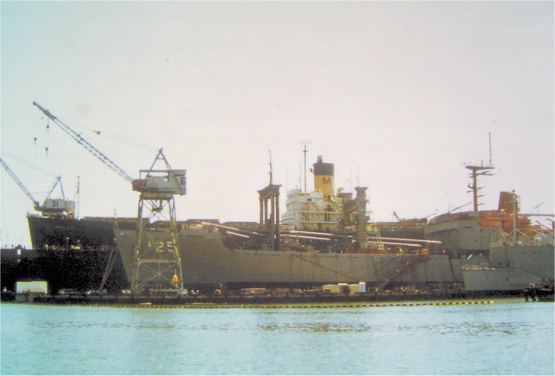 62k | USS Haleakala (AE-25) in a shipyard at San Francisco, CA., September 1978. In the drydock in the background is ex-USS Goodhue (APA-107) in commercial service as the Matson Lines SS Hawaiian Citizen. | Photo by Gerhard Mueller-Debus | |