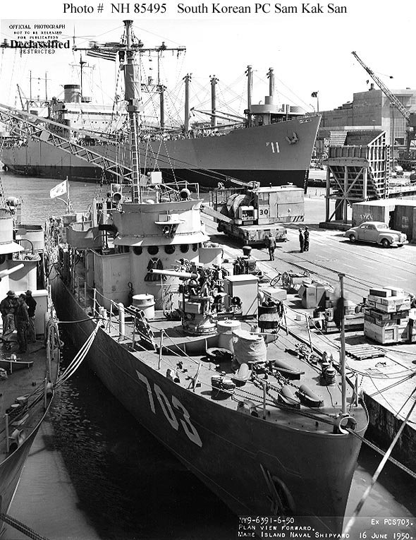 148k | USS Polaris (AF-11) in the background at Mare Island Naval Shipyard with ex-USS PCC-802 in the foreground, in South Korean service, as ROKS Sam Kak San (PC-703), Photo dated 16 June 1950. Actual date may be in July 1949. Note Polaris is flying a Union Jack at her bow. US Navy photo # NH 85485 now in the collections of the Naval Historical Center |